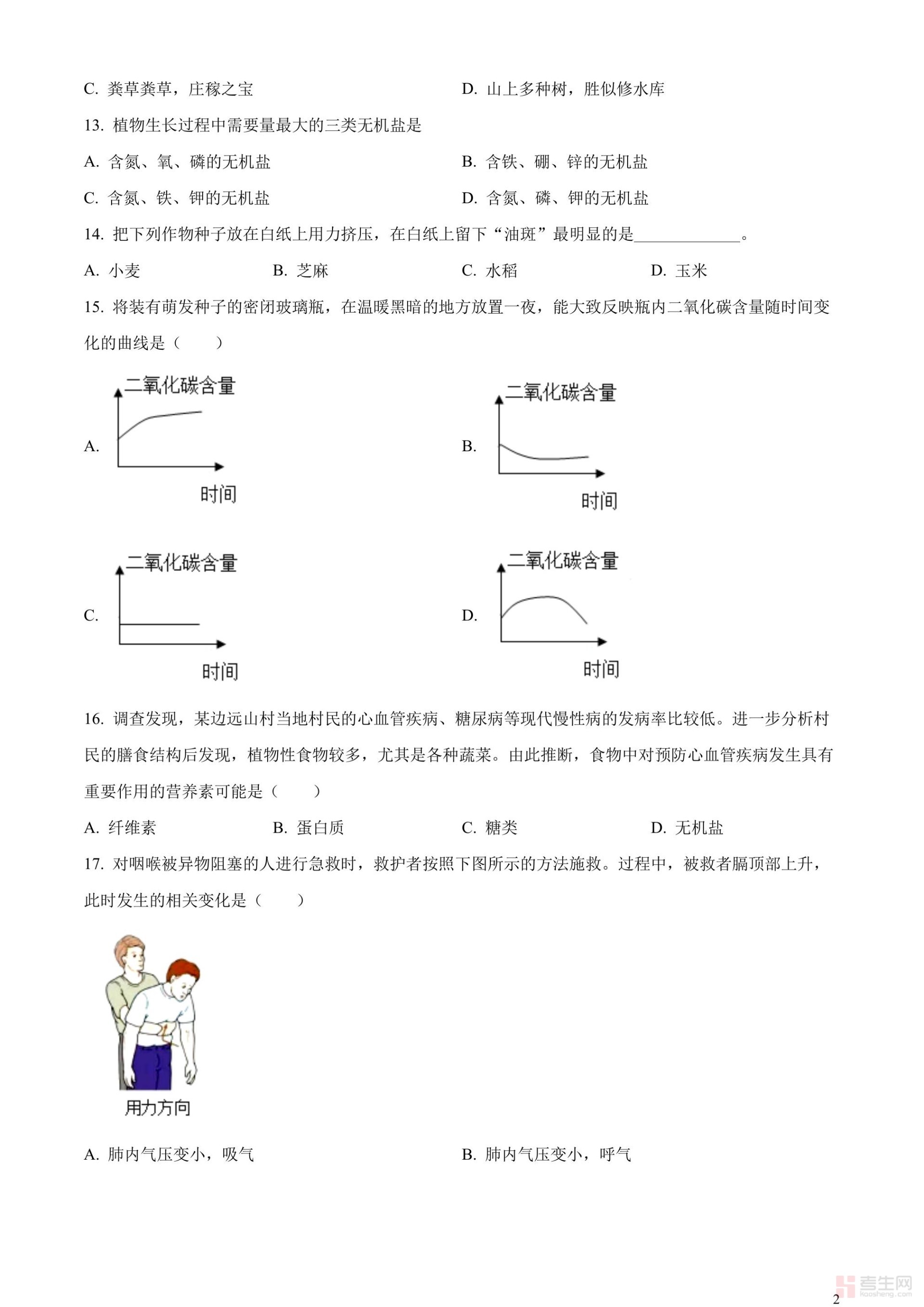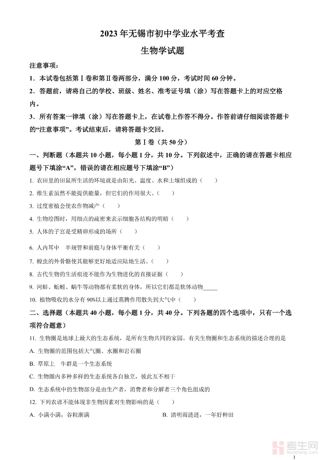 2023年江苏省无锡市初中学业水平考查生物试题(原卷版)