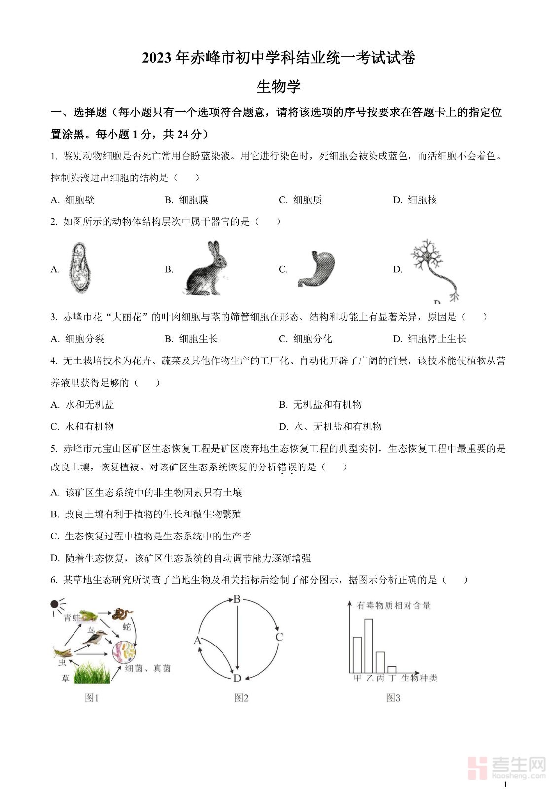 2023年内蒙古赤峰市中考生物真题(原卷版)