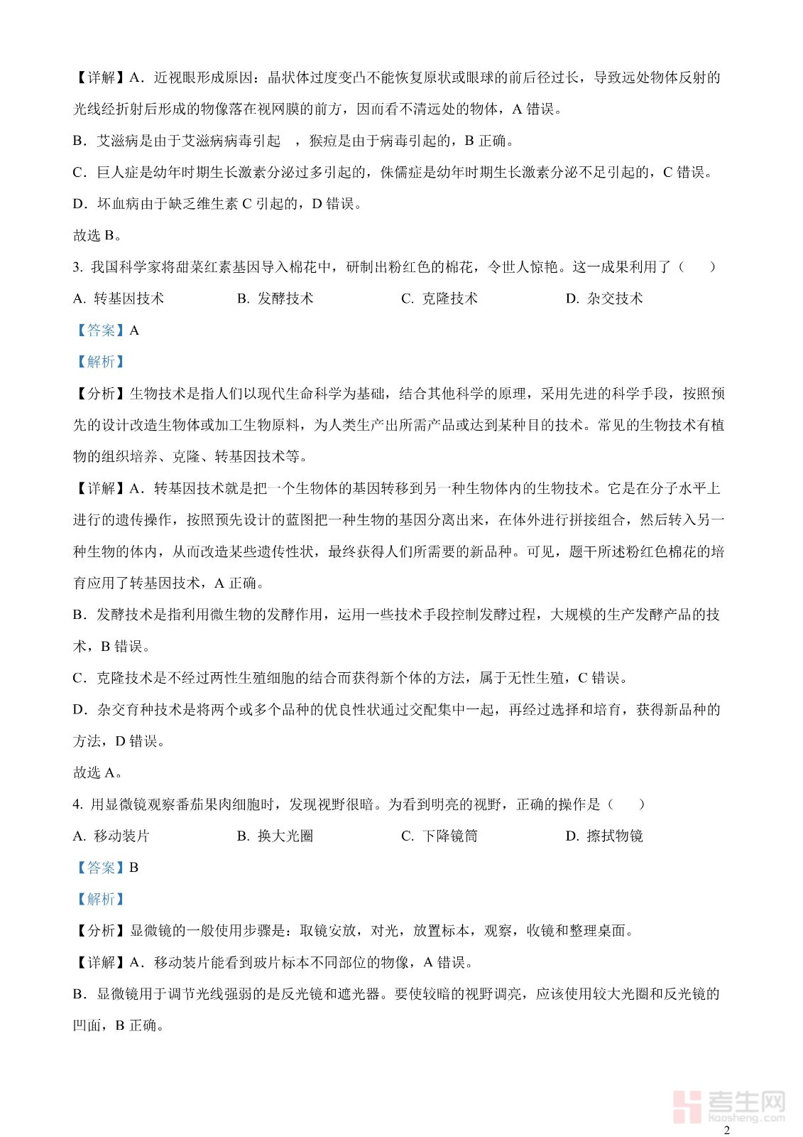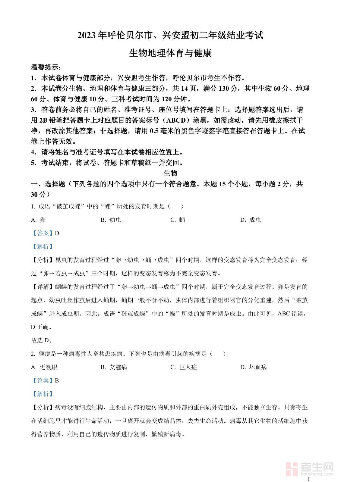 2023年内蒙古呼伦贝尔市结业考试生物真题(解析版)