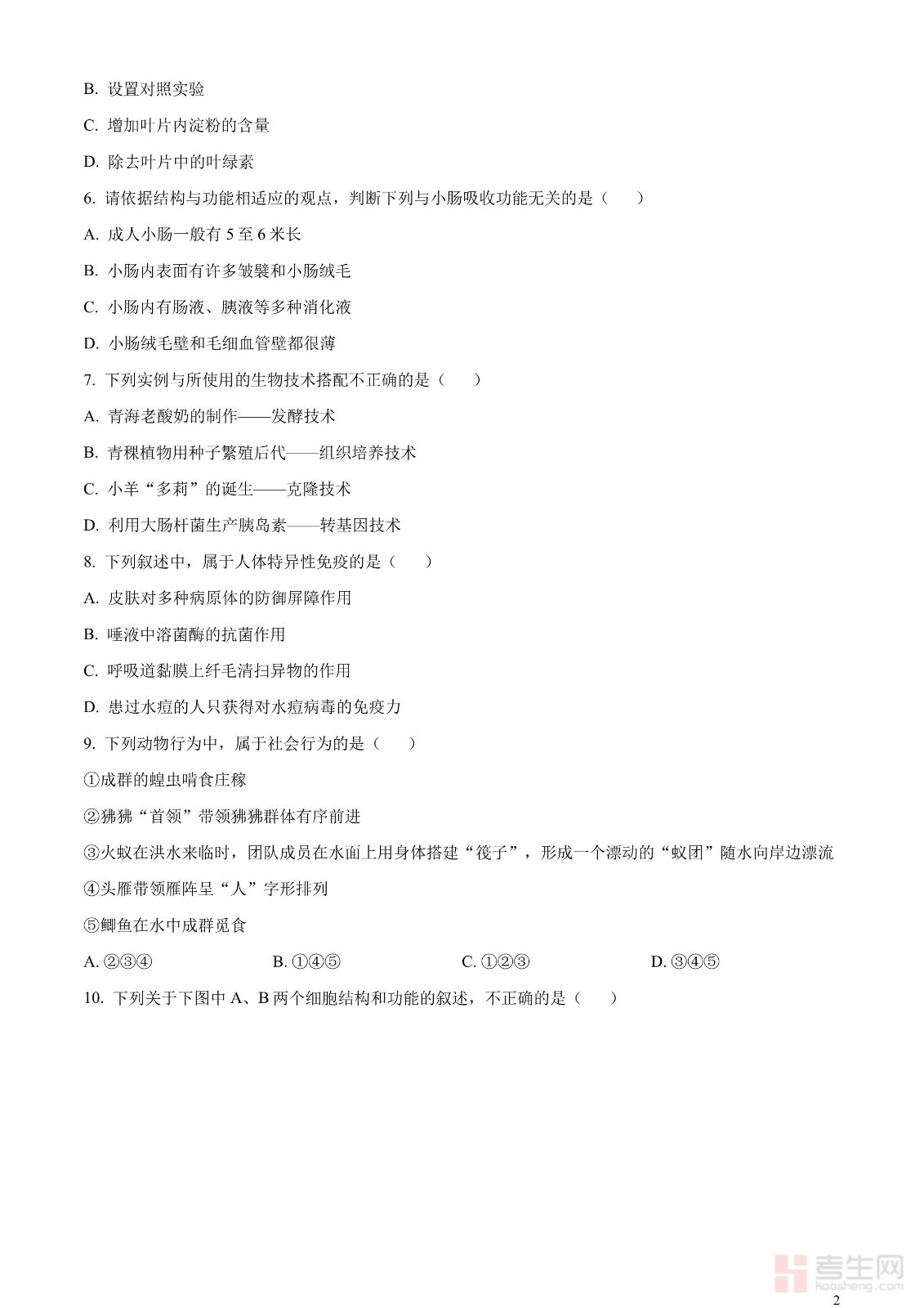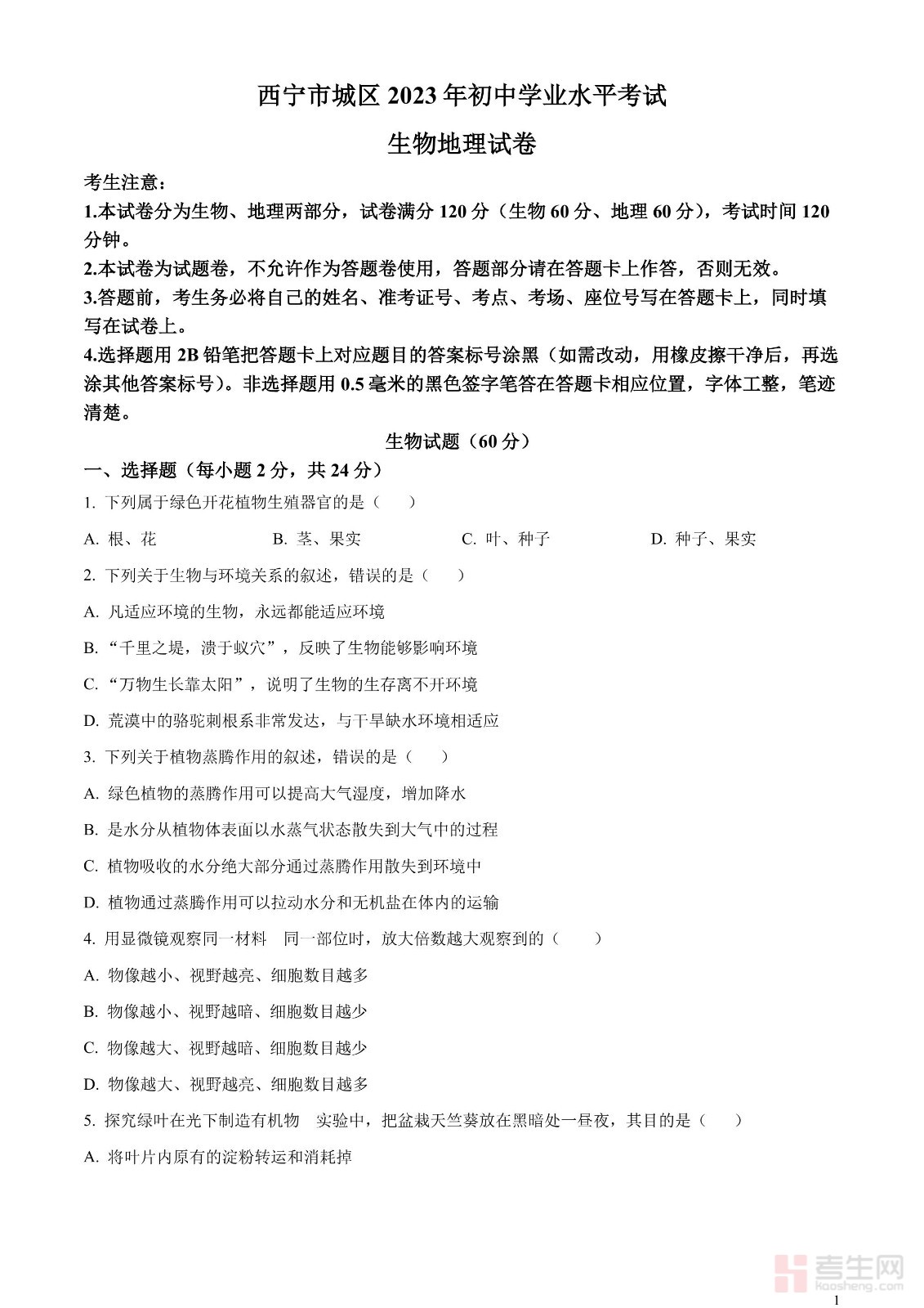 2023年青海省西宁市城区2023年中考生物真题(原卷版)