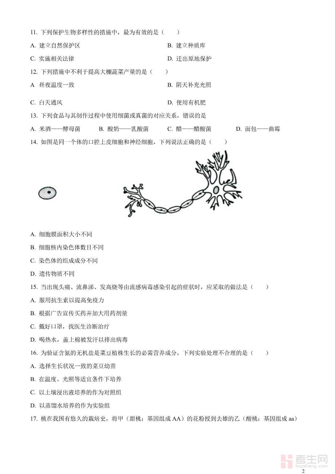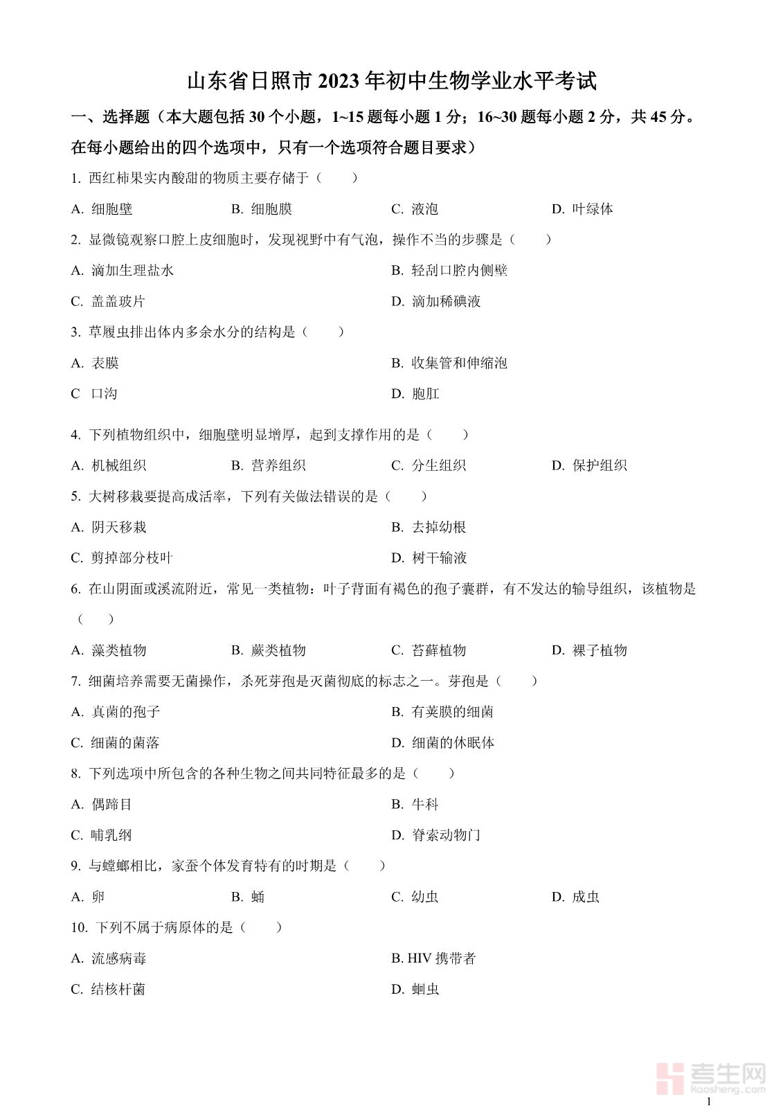 2023年山东省日照市生物中考真题(原卷版)