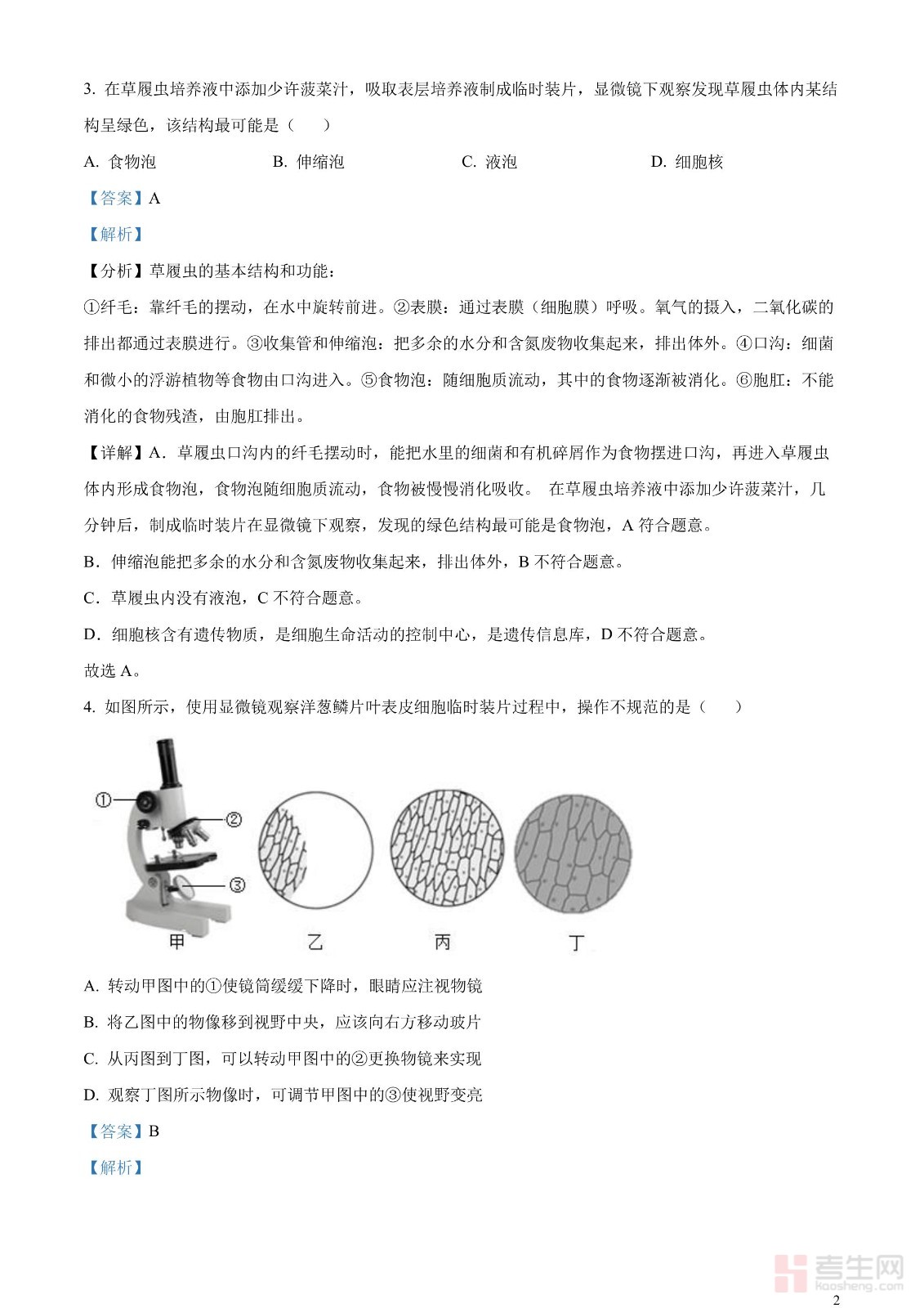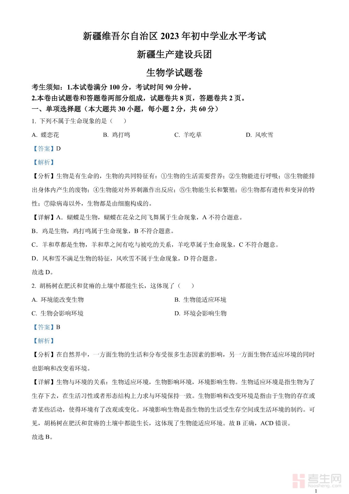 2023年新疆维吾尔自治区新疆生产建设兵团中考生物真题(解析版)