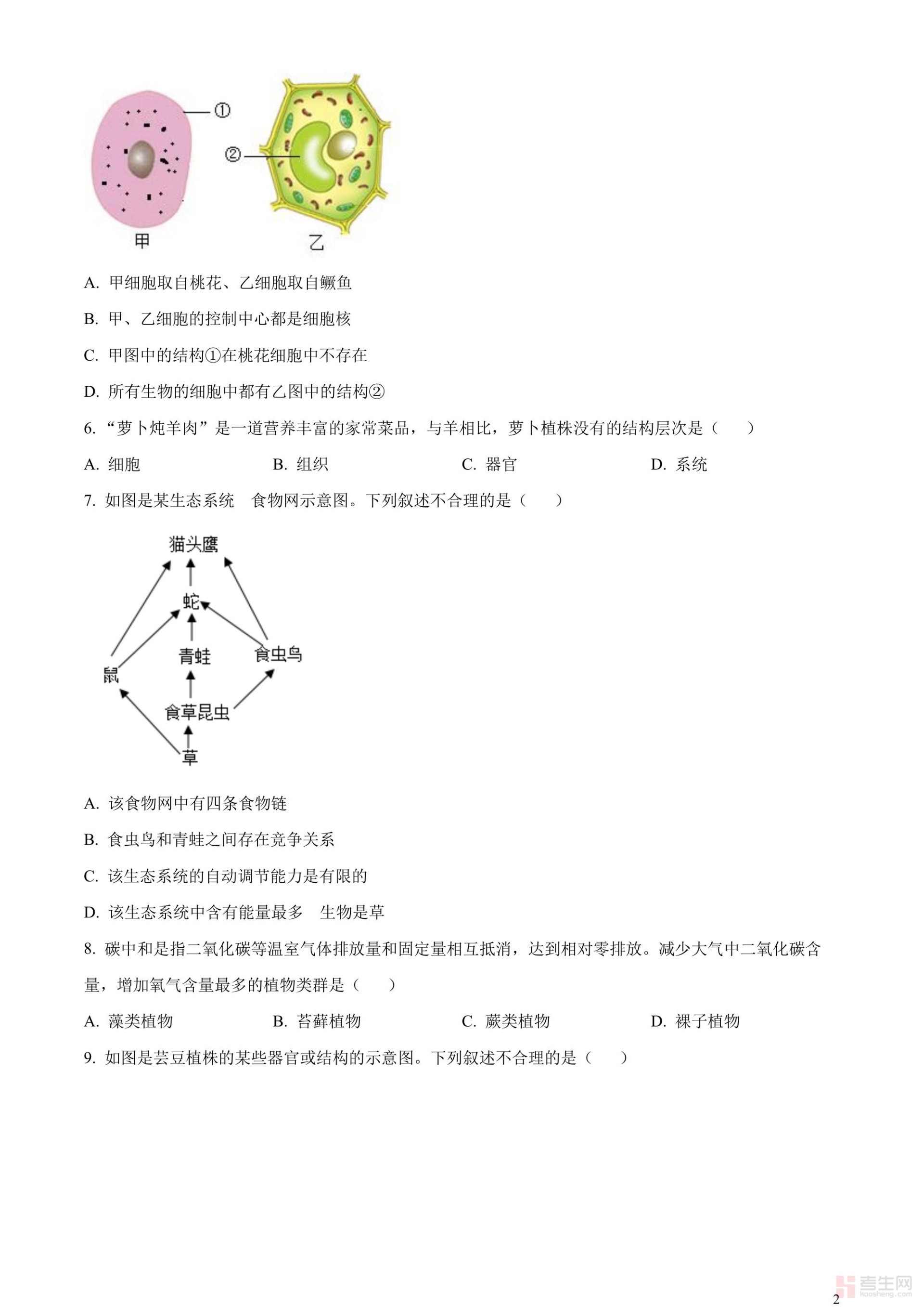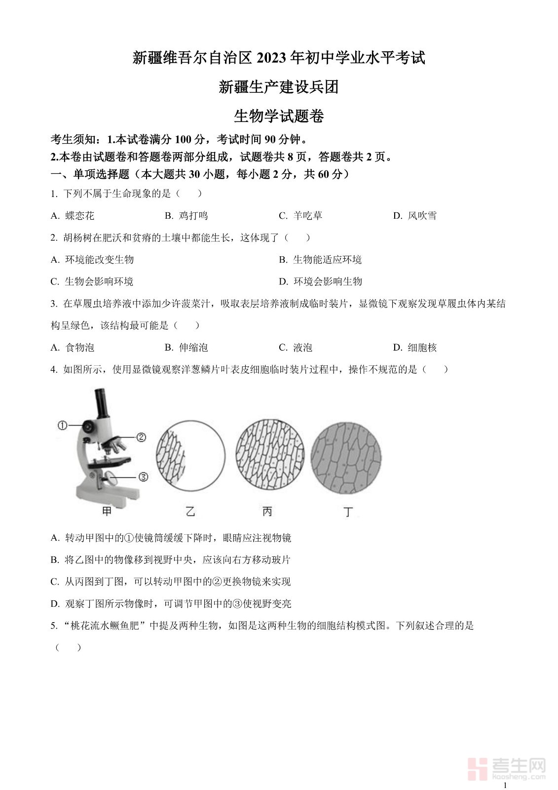 2023年新疆维吾尔自治区新疆生产建设兵团中考生物真题(原卷版)