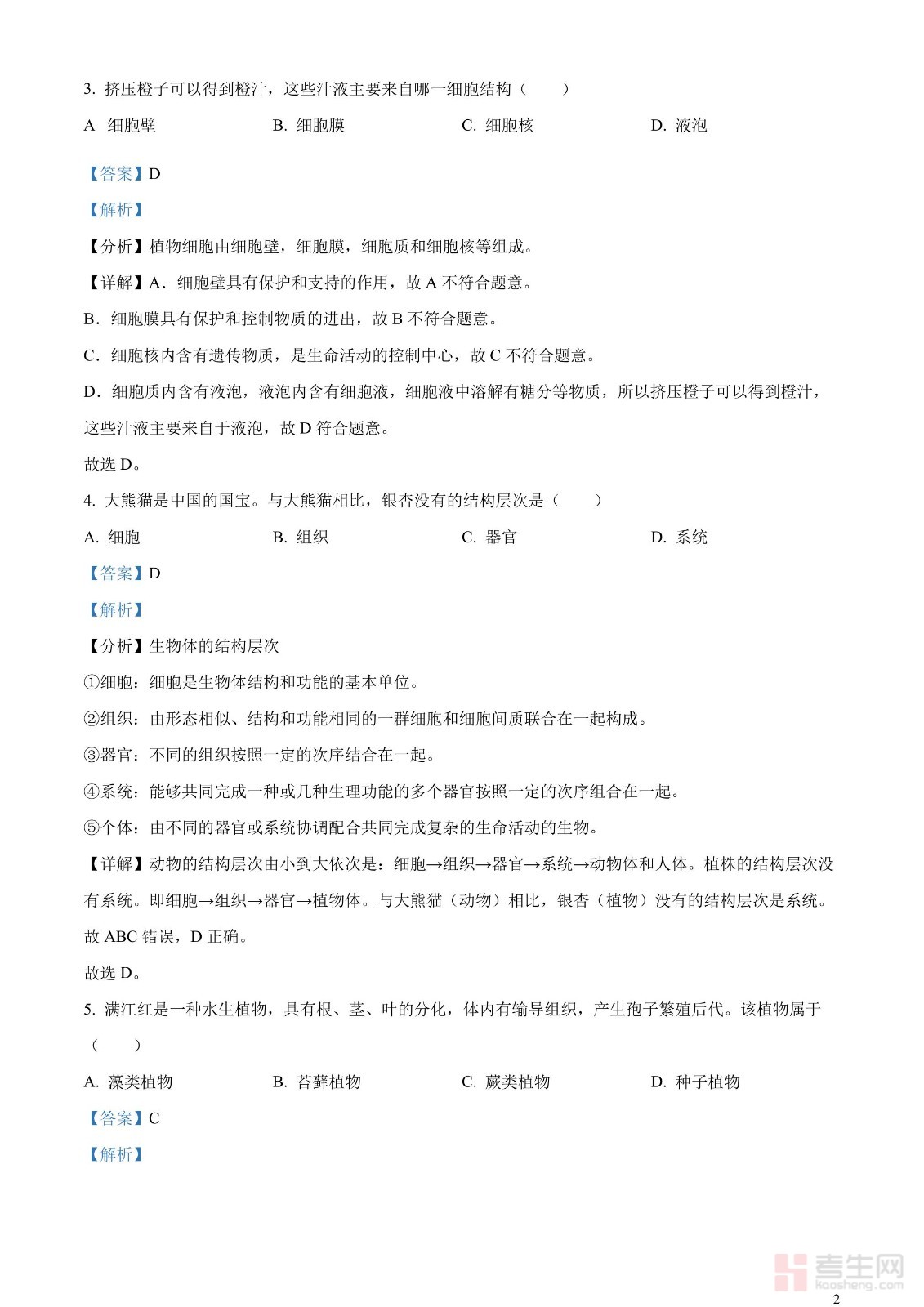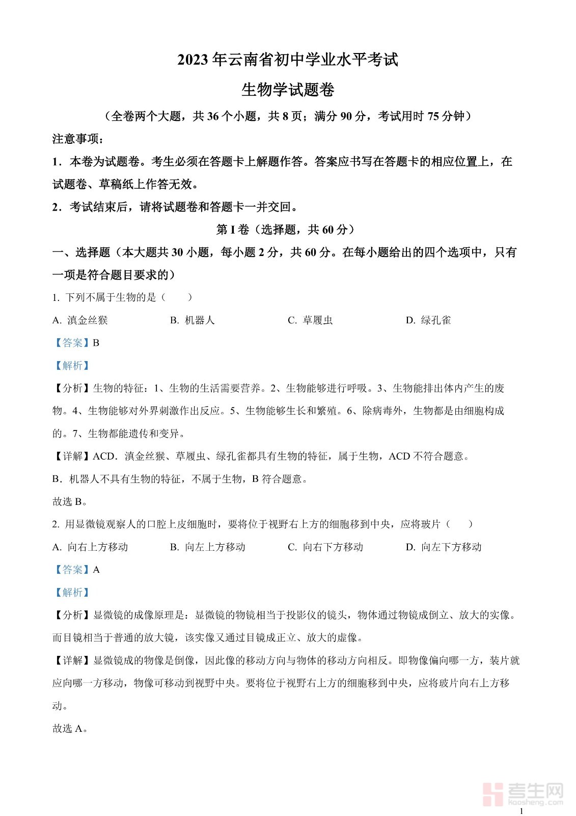 2023年云南省中考生物真题(解析版)