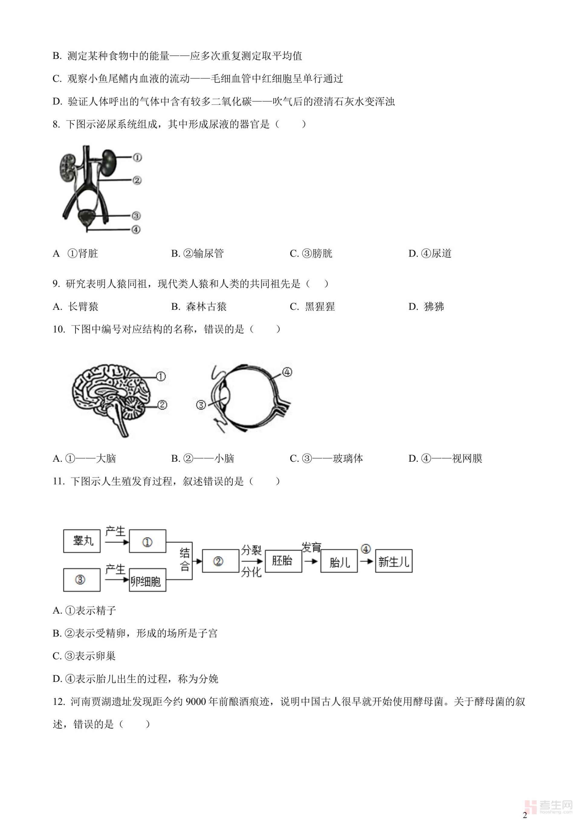 2023年重庆市中考生物真题(原卷版)