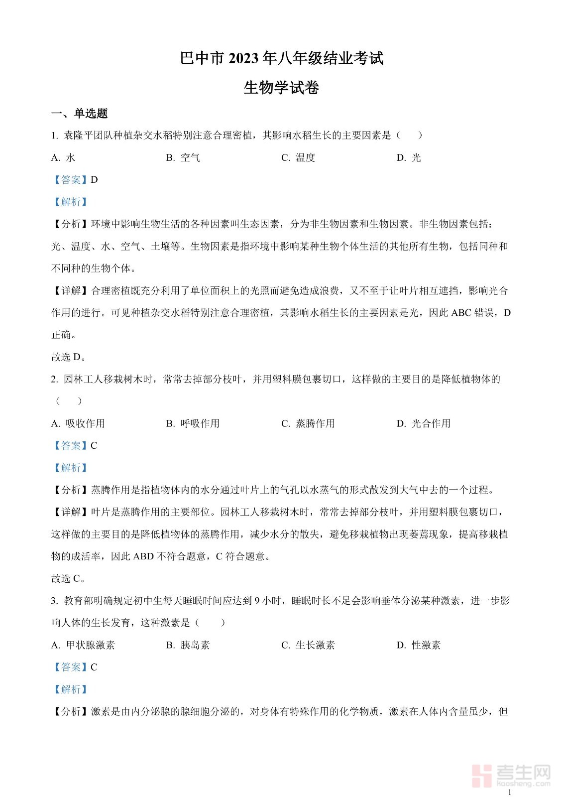 四川省巴中市2022-2023学年八年级下学期(结业考试)生物试题(解析版)