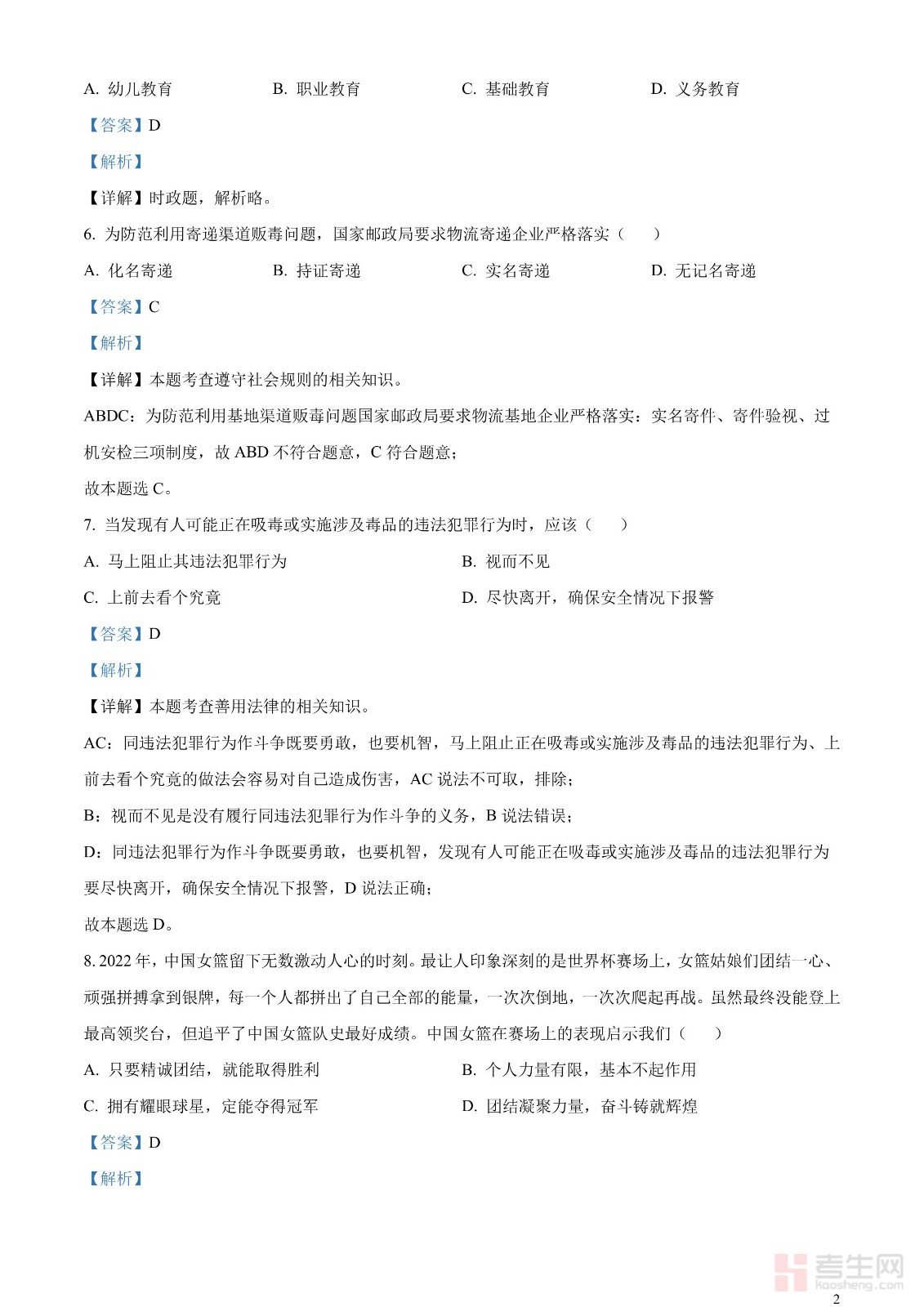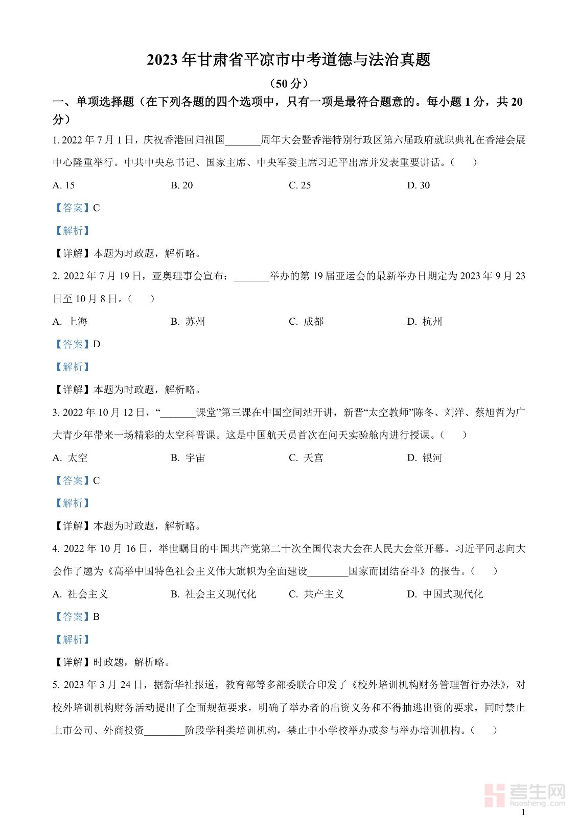2023年甘肃省平凉市中考道德与法治真题(解析版)