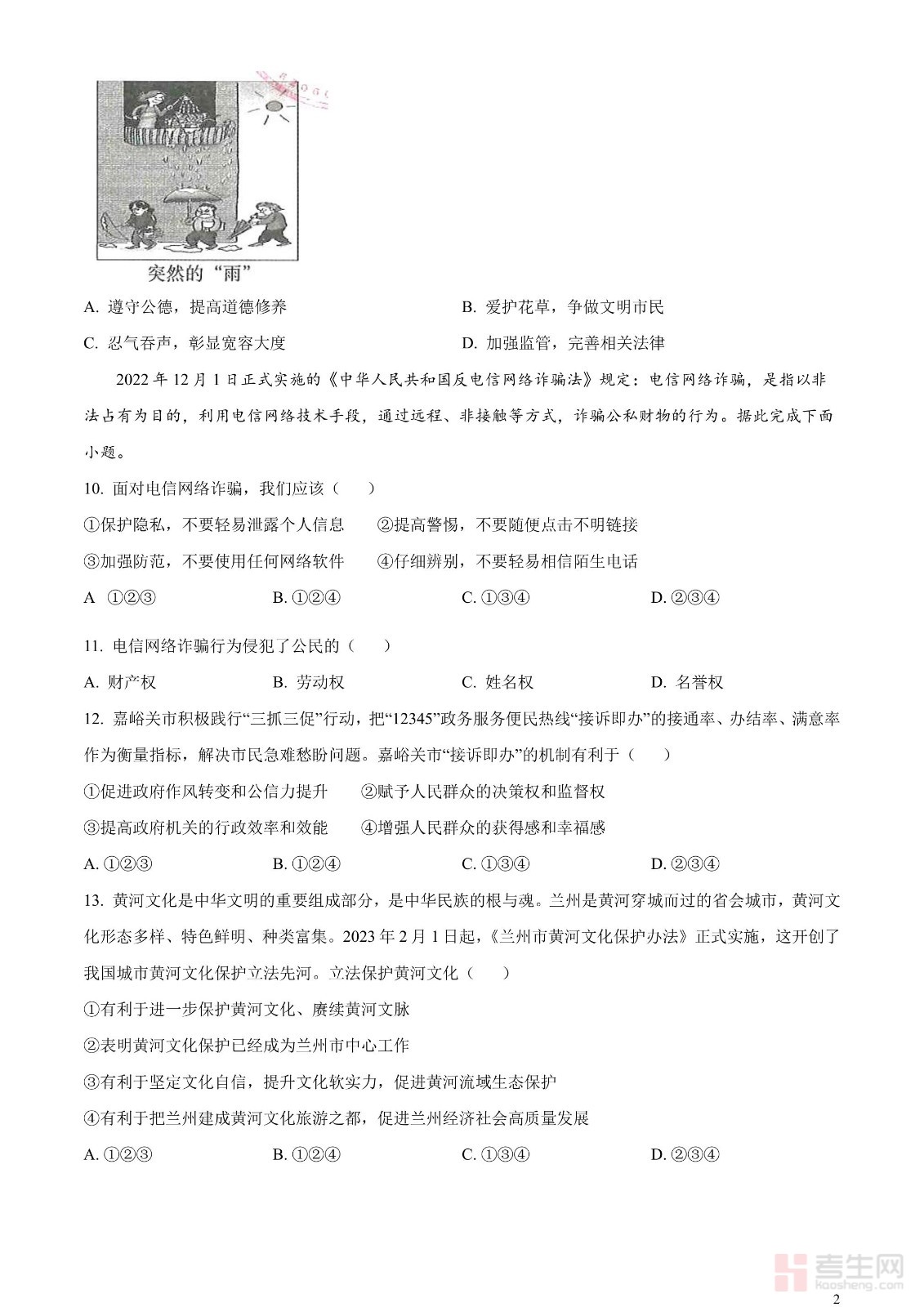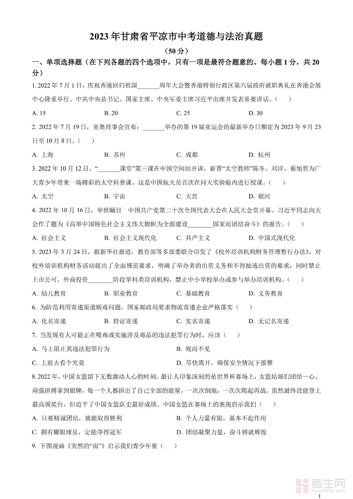 2023年甘肃省平凉市中考道德与法治真题(原卷版)