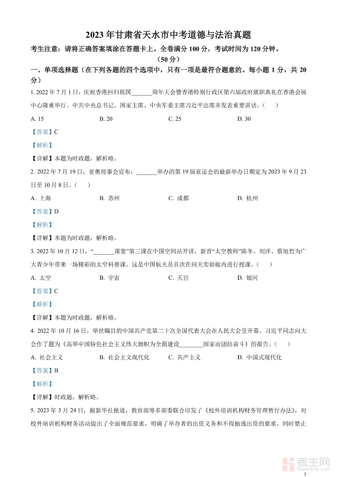 2023年甘肃省天水市中考道德与法治真题(解析版)