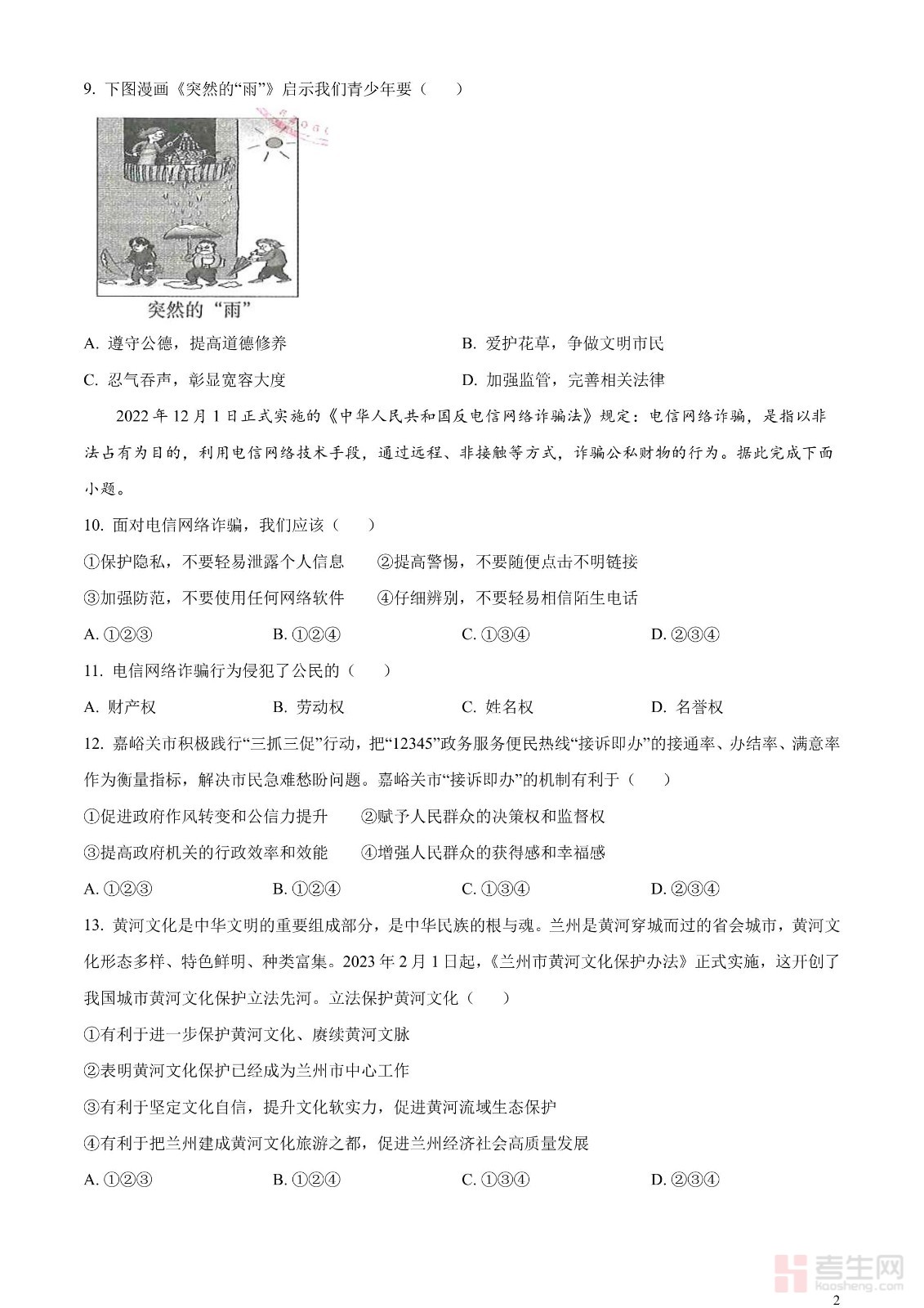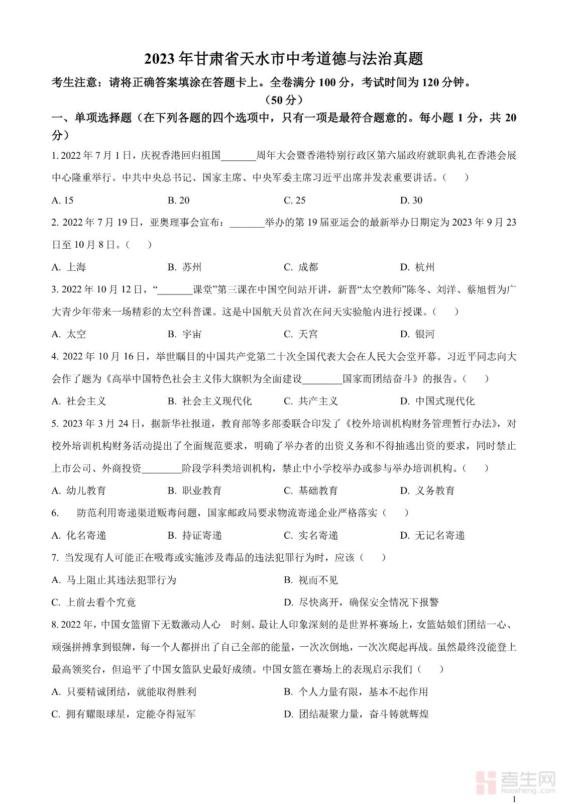 2023年甘肃省天水市中考道德与法治真题(原卷版)