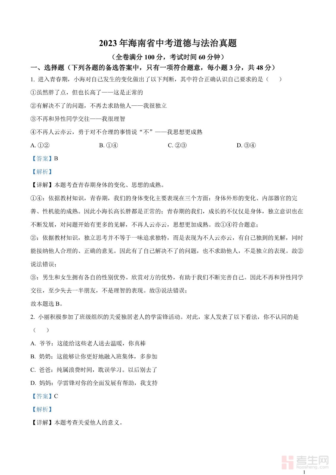 2023年海南省中考道德与法治真题(解析版)