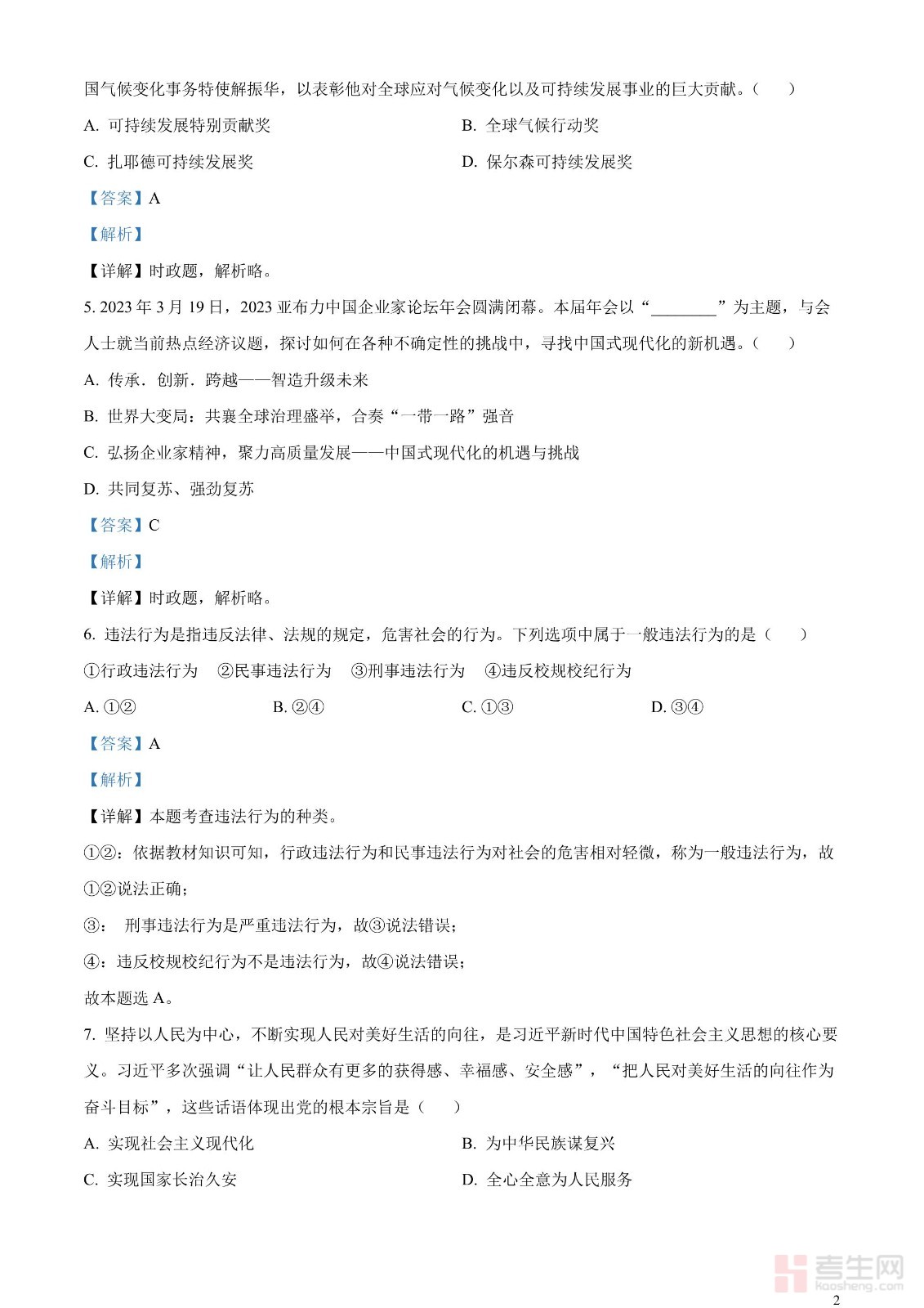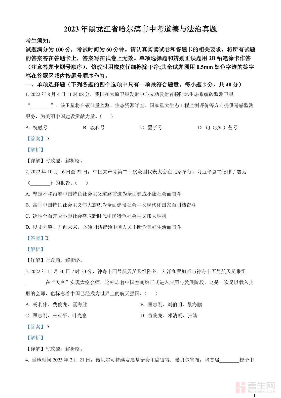 2023年黑龙江省哈尔滨市中考道德与法治真题(解析版)
