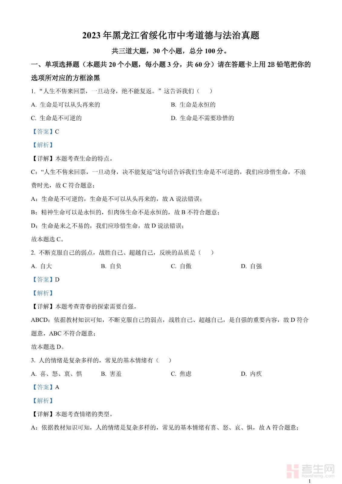 2023年黑龙江省绥化市中考道德与法治真题(解析版)
