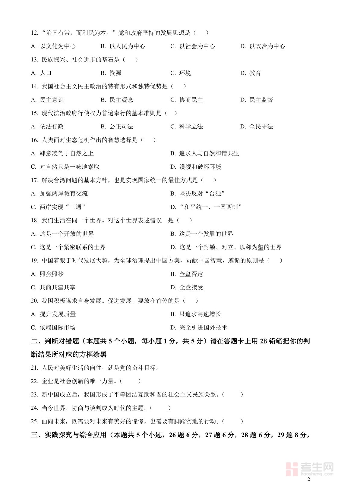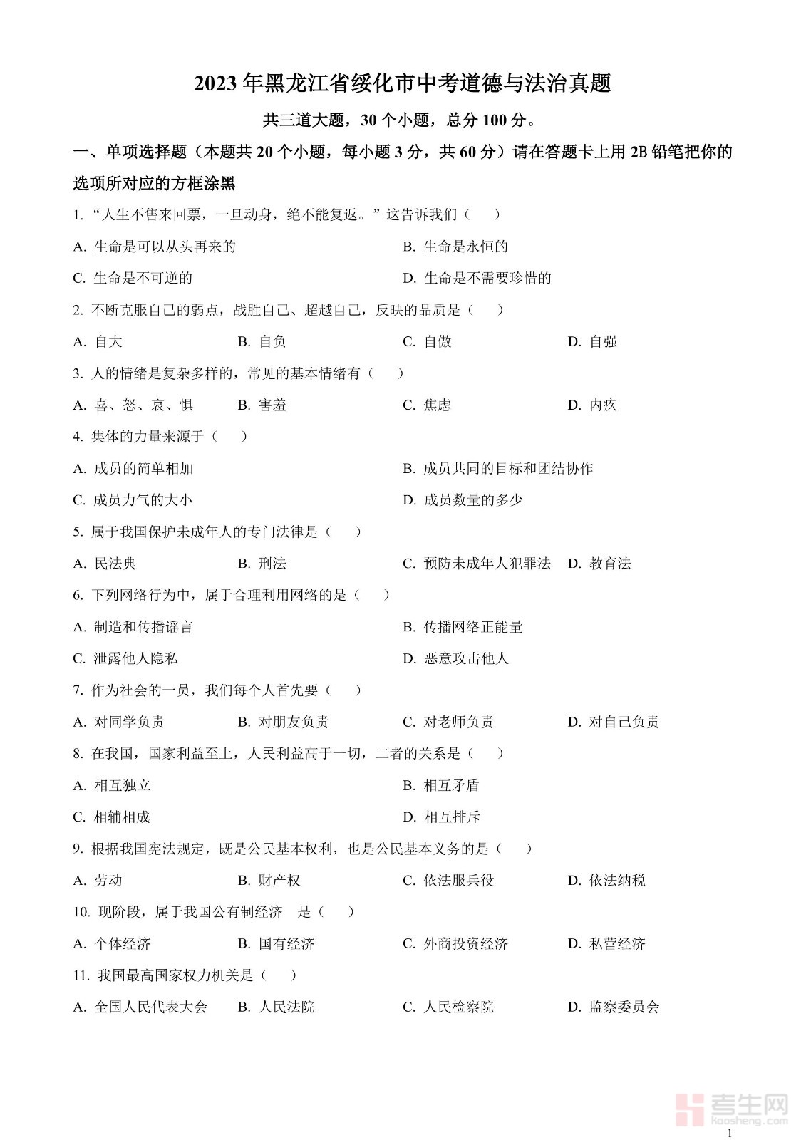2023年黑龙江省绥化市中考道德与法治真题(原卷版)