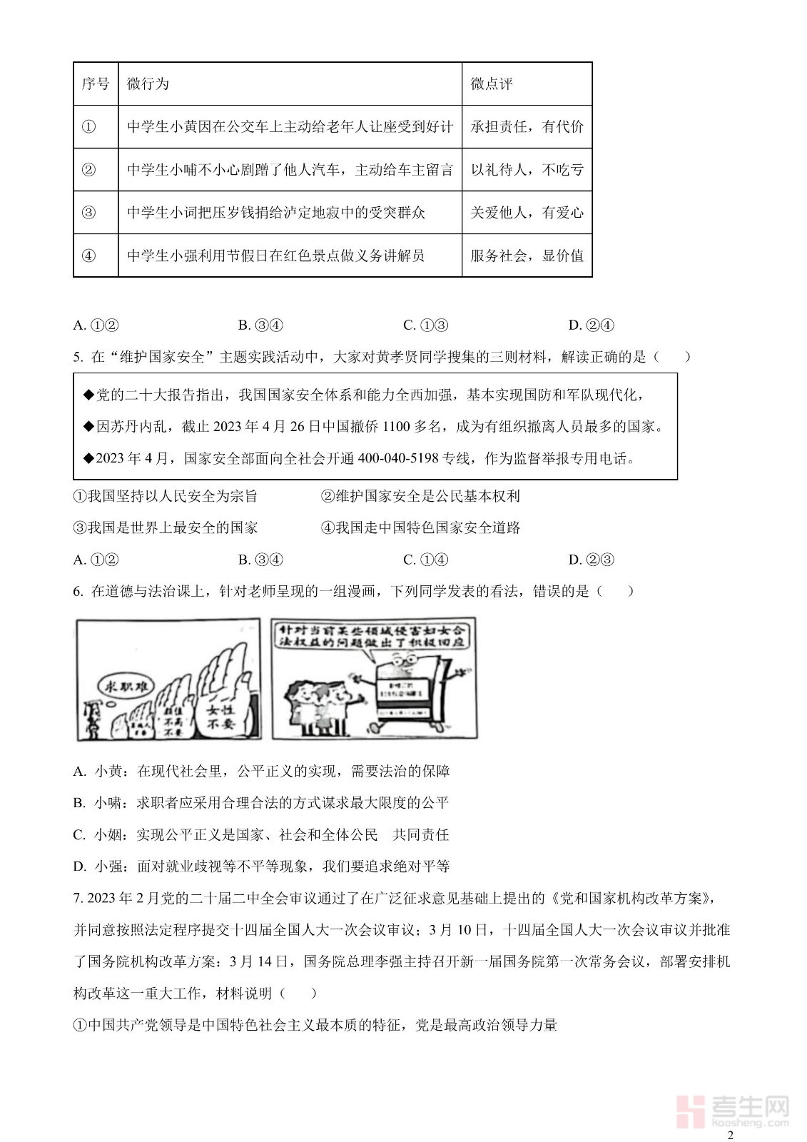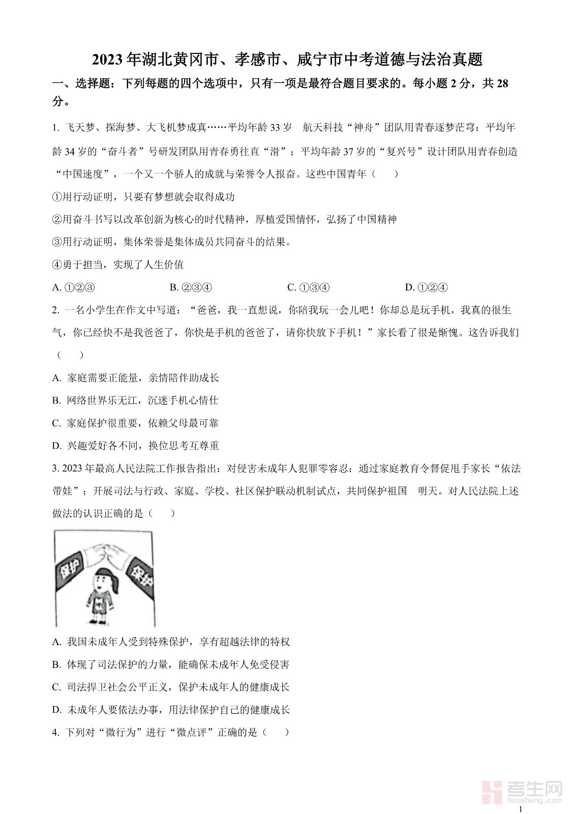精品解析:2023年湖北黄冈市、孝感市、咸宁市中考道德与法治真题(原卷版)