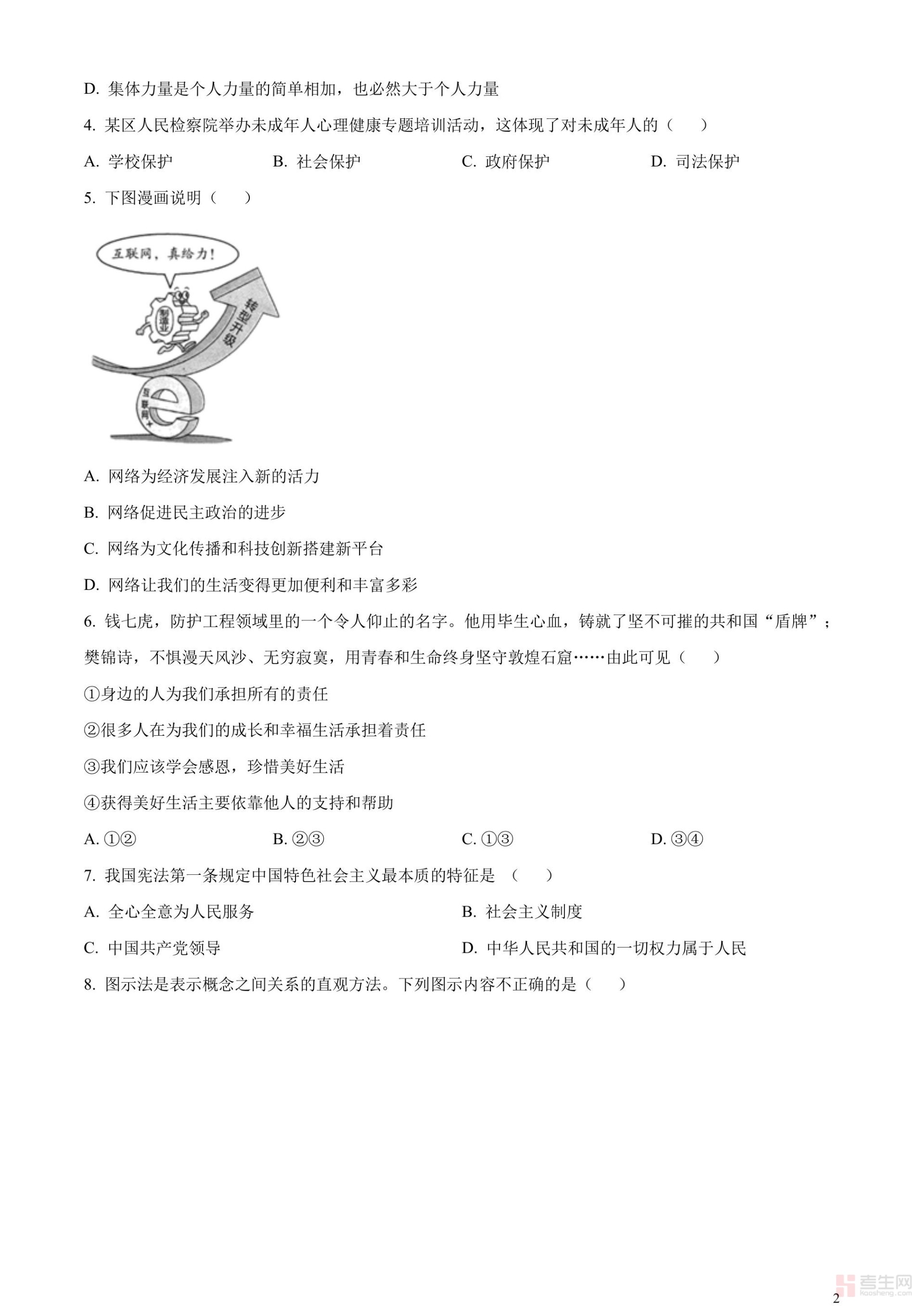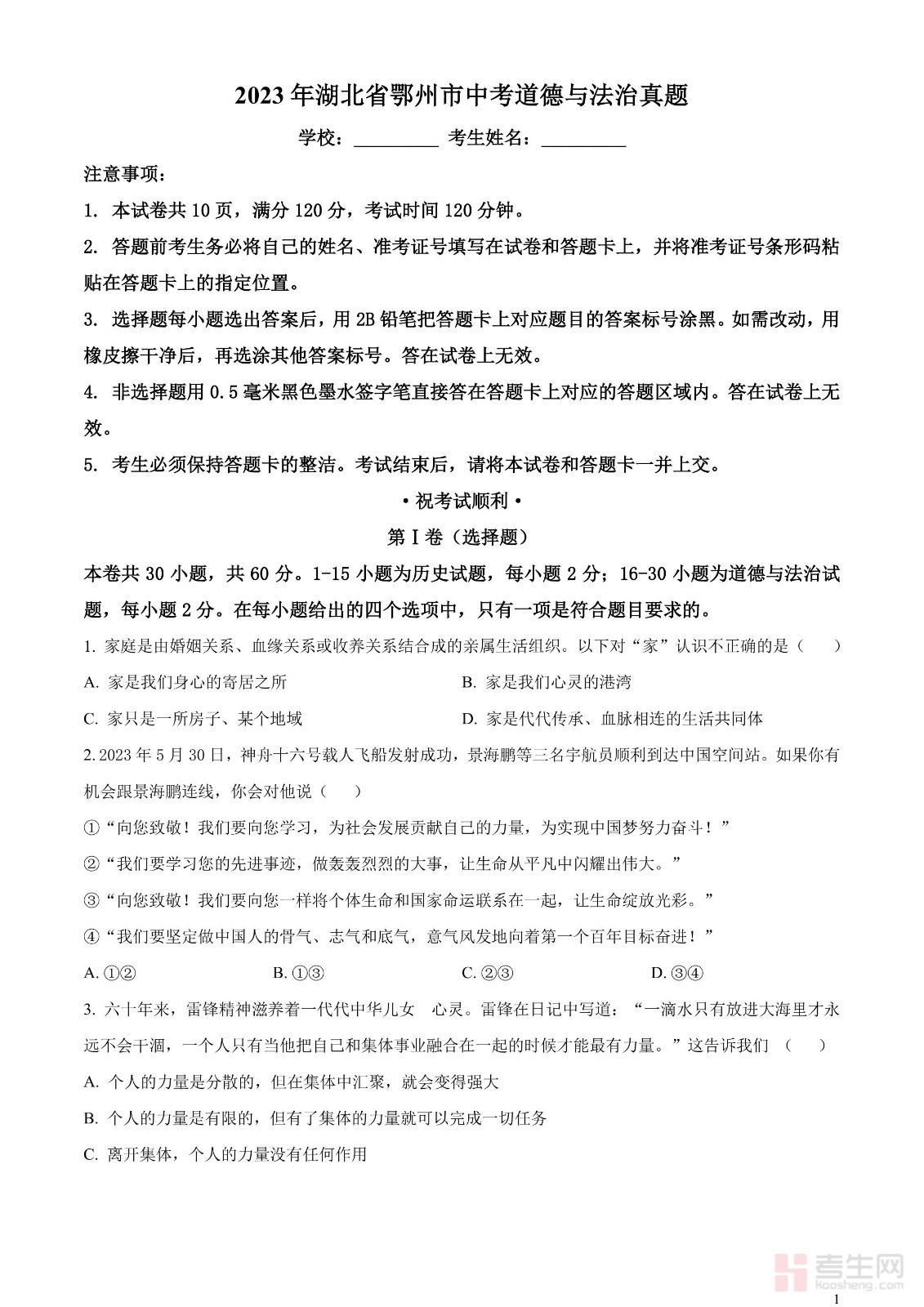 2023年湖北省鄂州市中考道德与法治真题(原卷版)