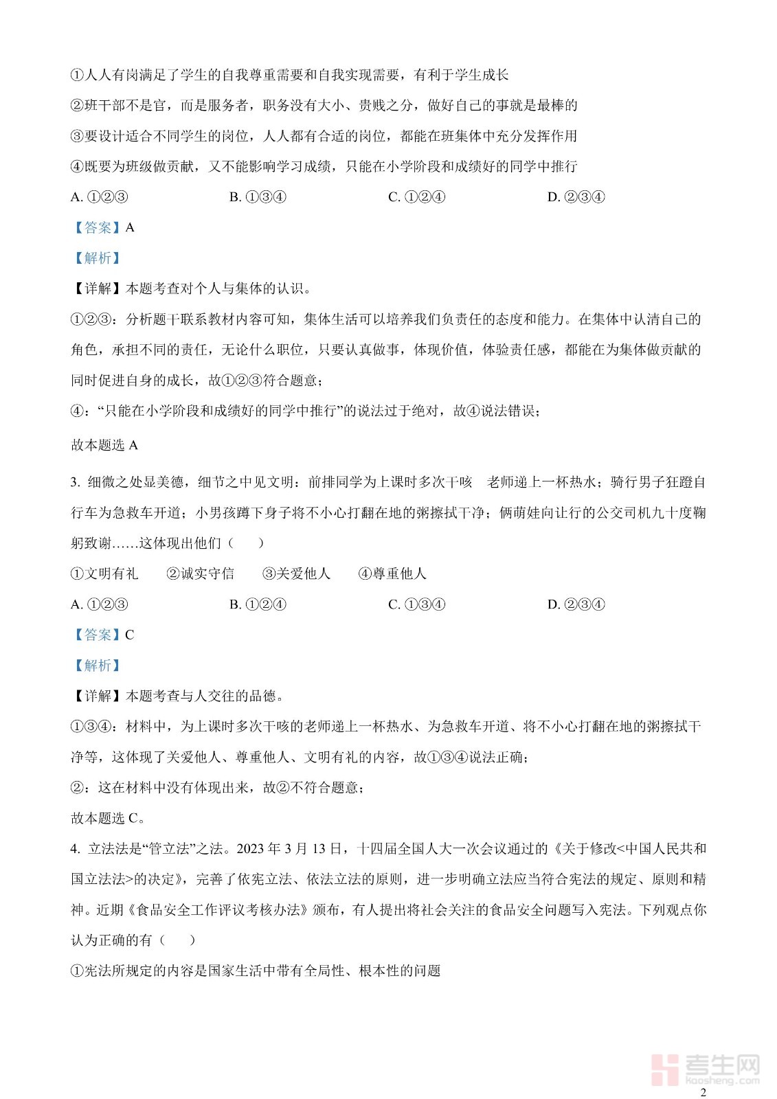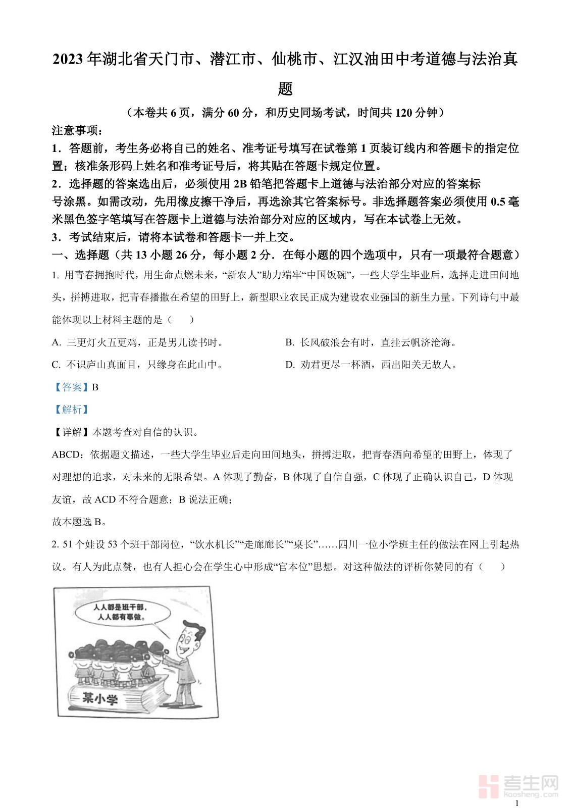 2023年湖北省天门市、潜江市、仙桃市、江汉油田中考道德与法治真题(解析版)