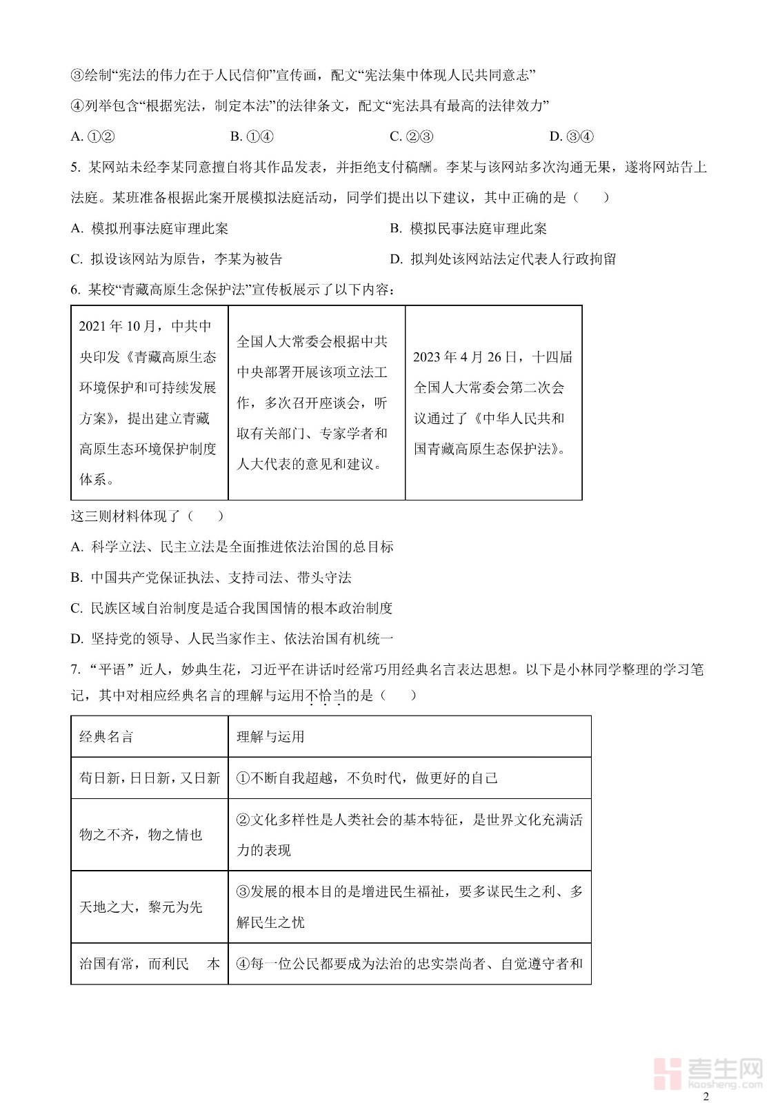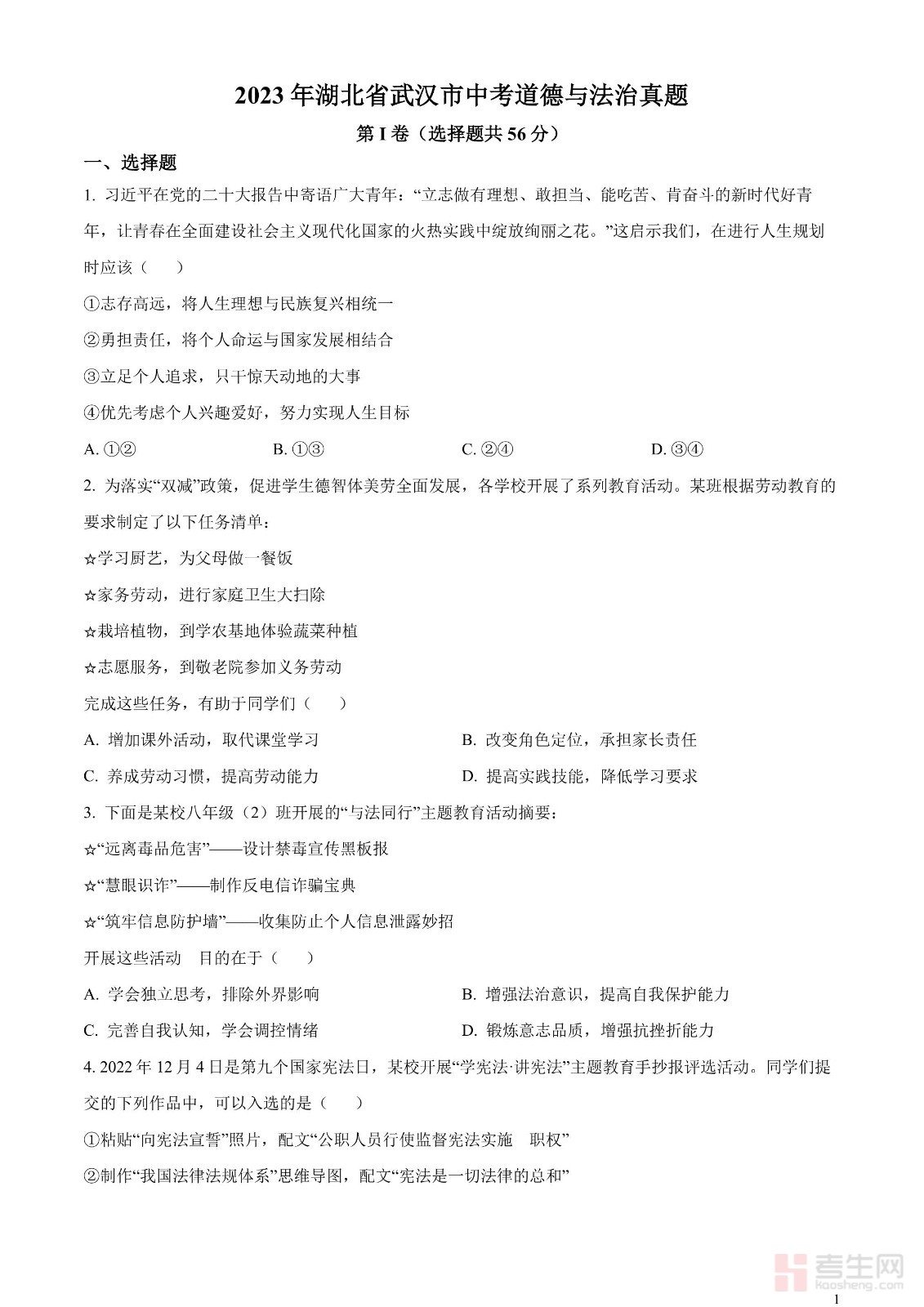 2023年湖北省武汉市中考道德与法治真题(原卷版)