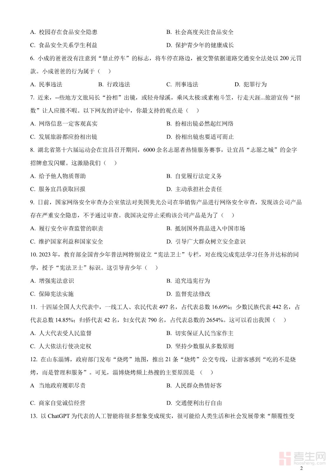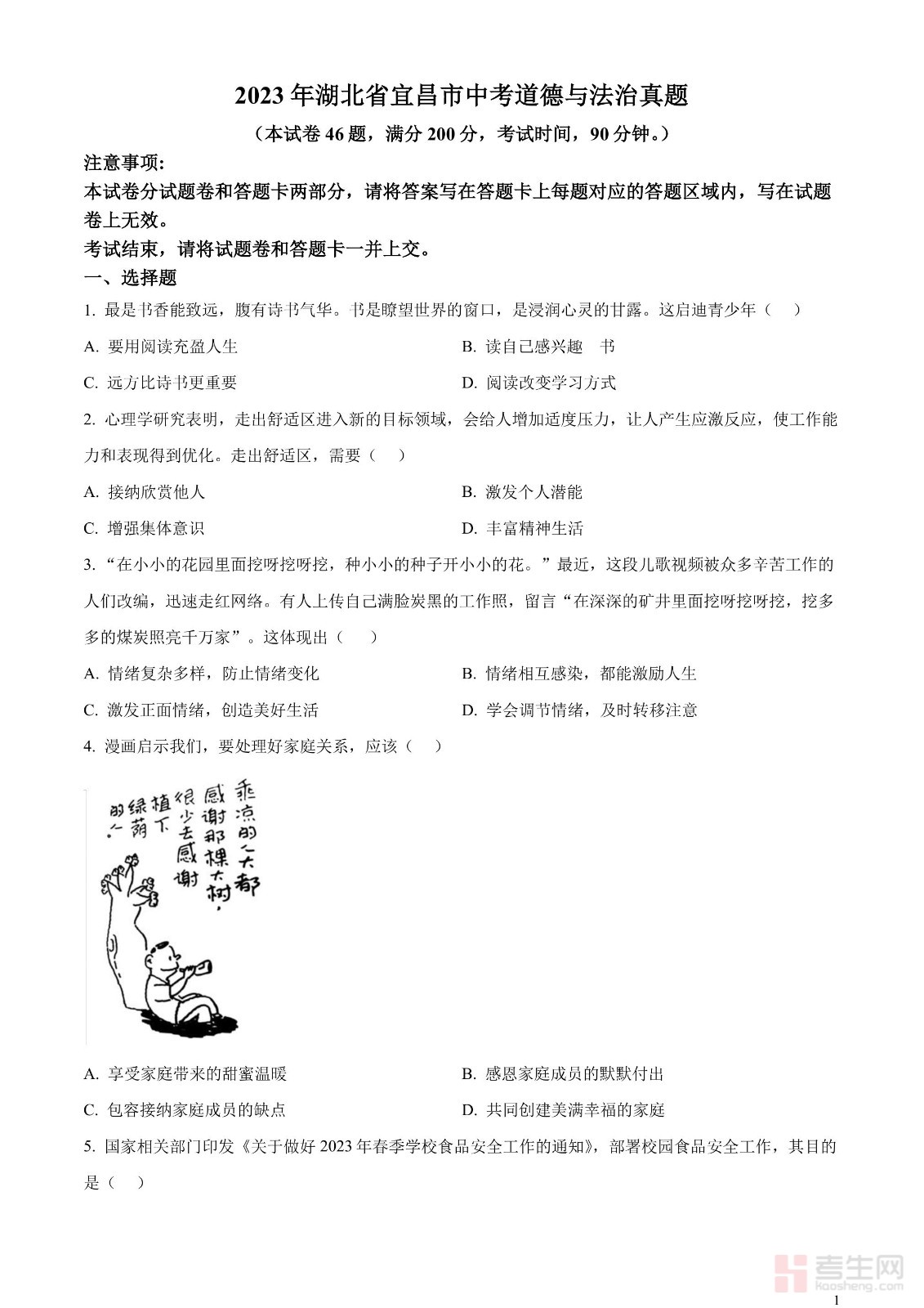 2023年湖北省宜昌市中考道德与法治真题(原卷版)