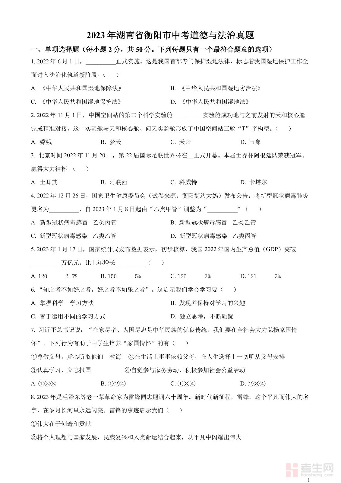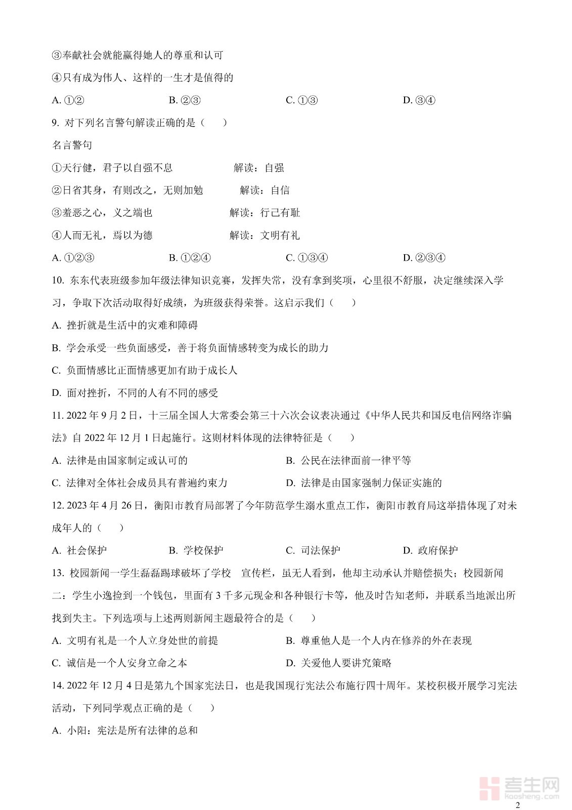 2023年湖南省衡阳市中考道德与法治真题(原卷版)