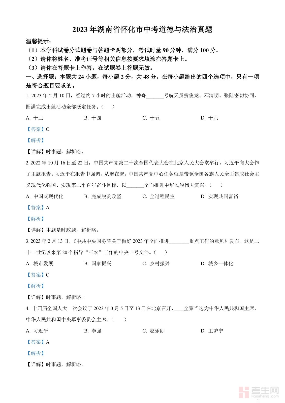 2023年湖南省怀化市中考道德与法治真题(解析版)
