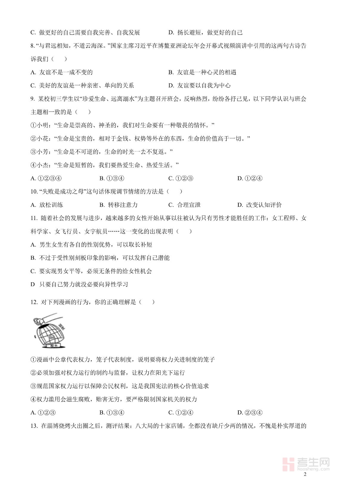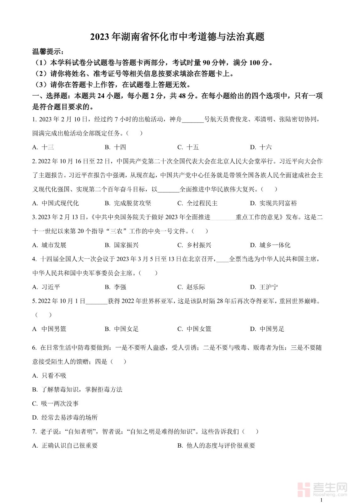 2023年湖南省怀化市中考道德与法治真题(原卷版)