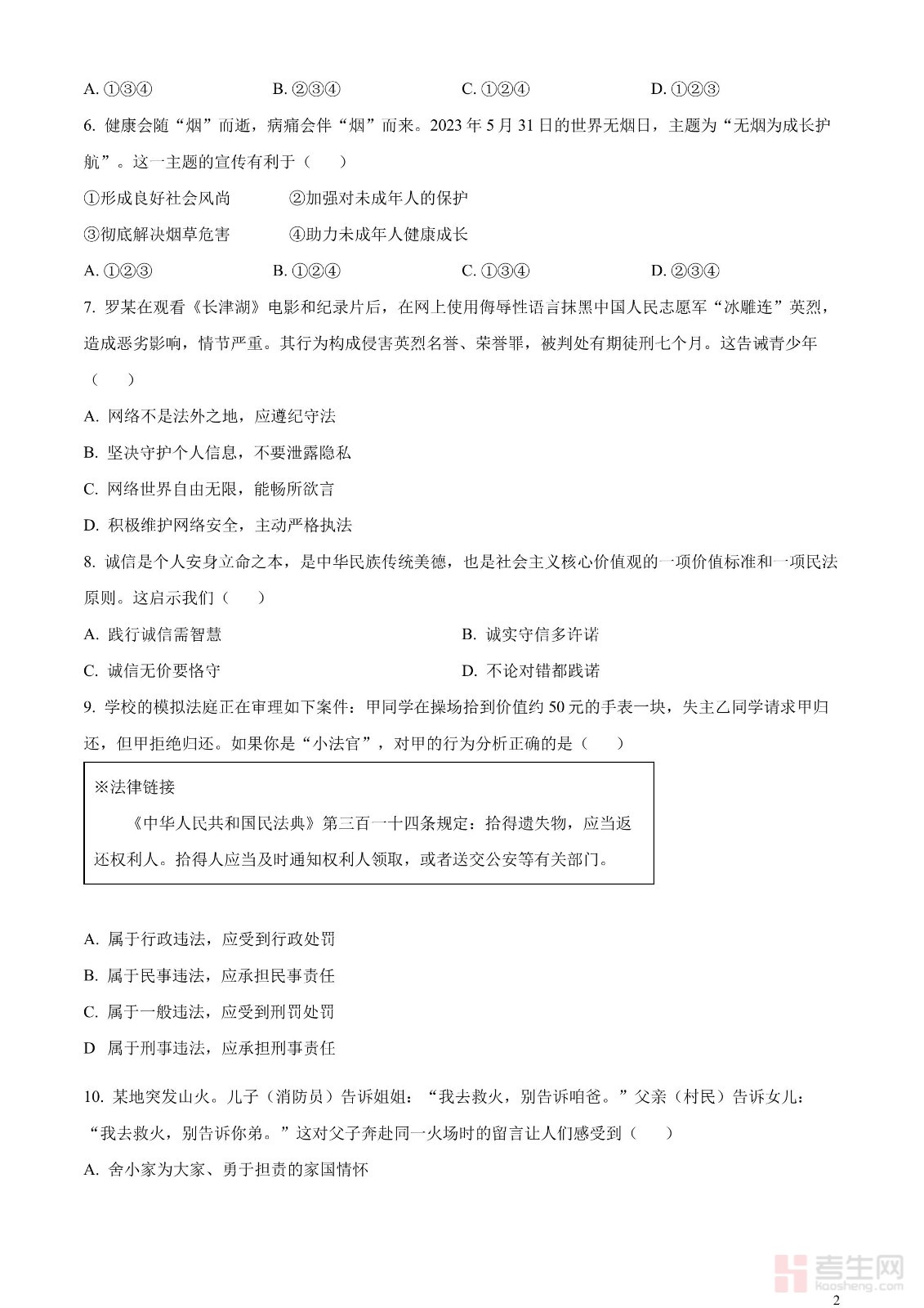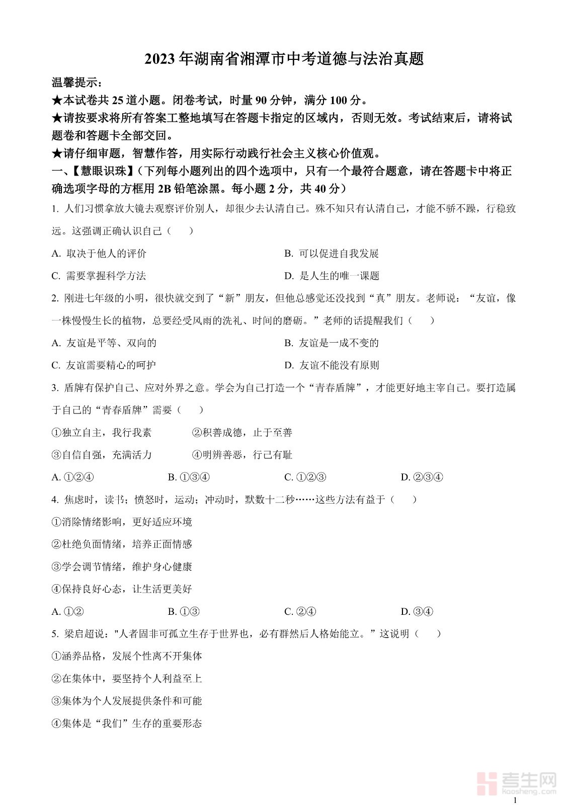 2023年湖南省湘潭市中考道德与法治真题(原卷版)