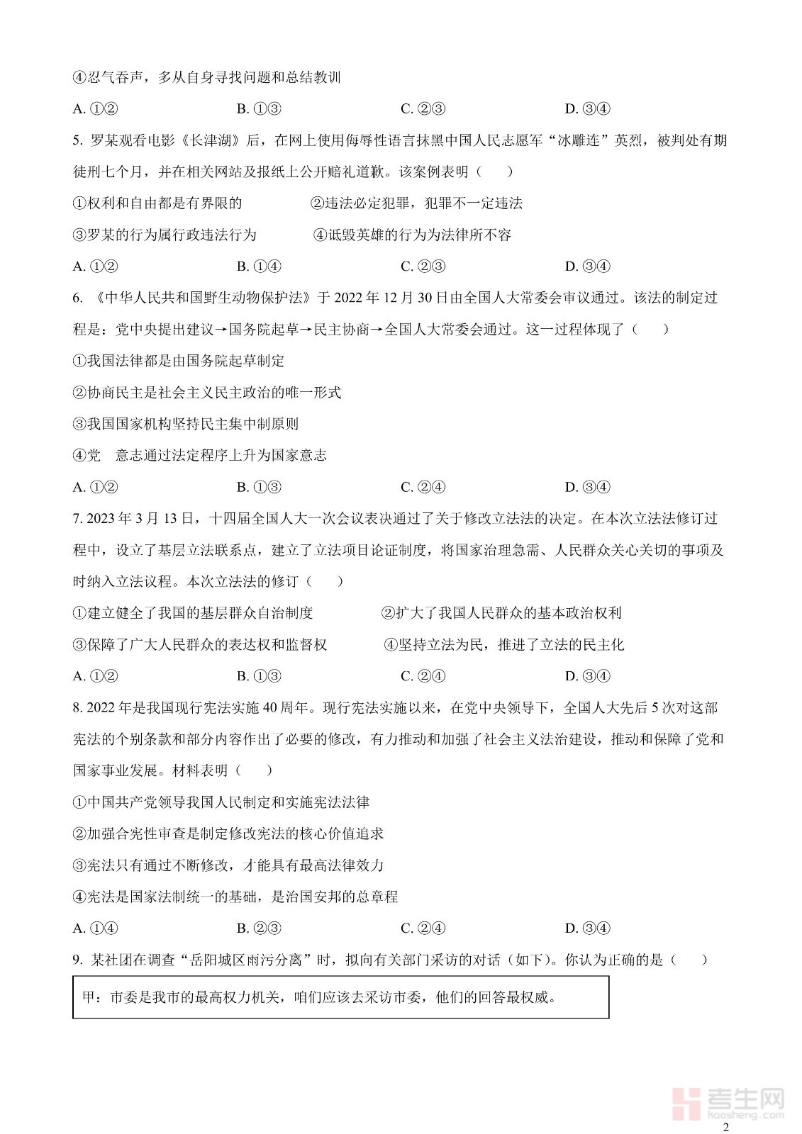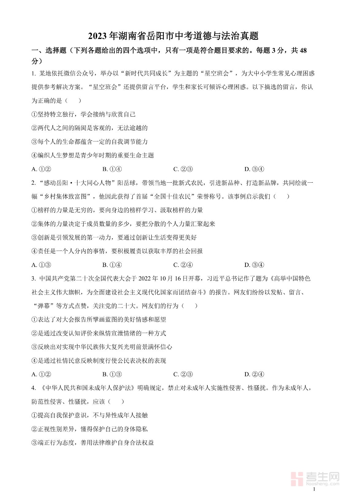 2023年湖南省岳阳市中考道德与法治真题(原卷版)
