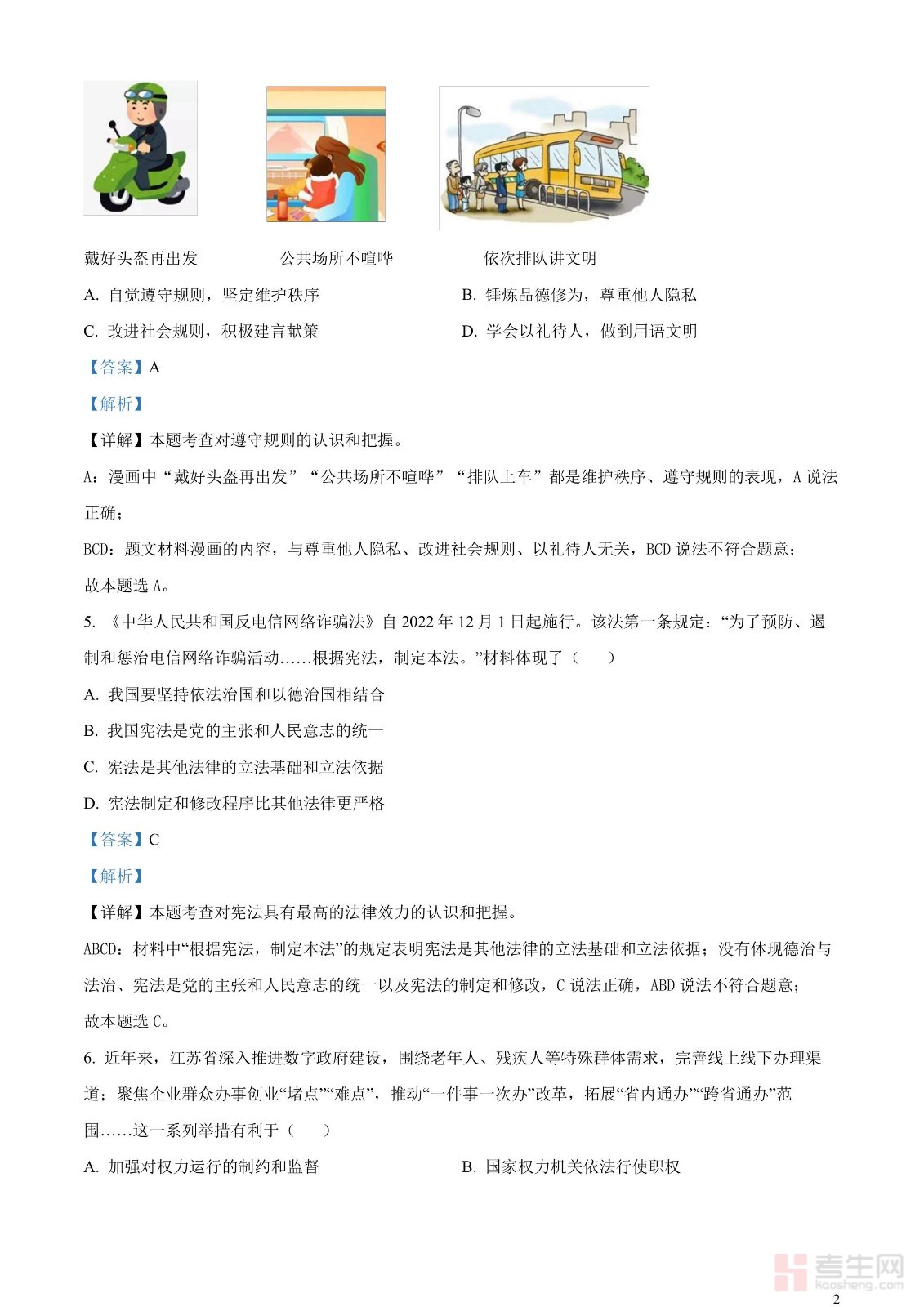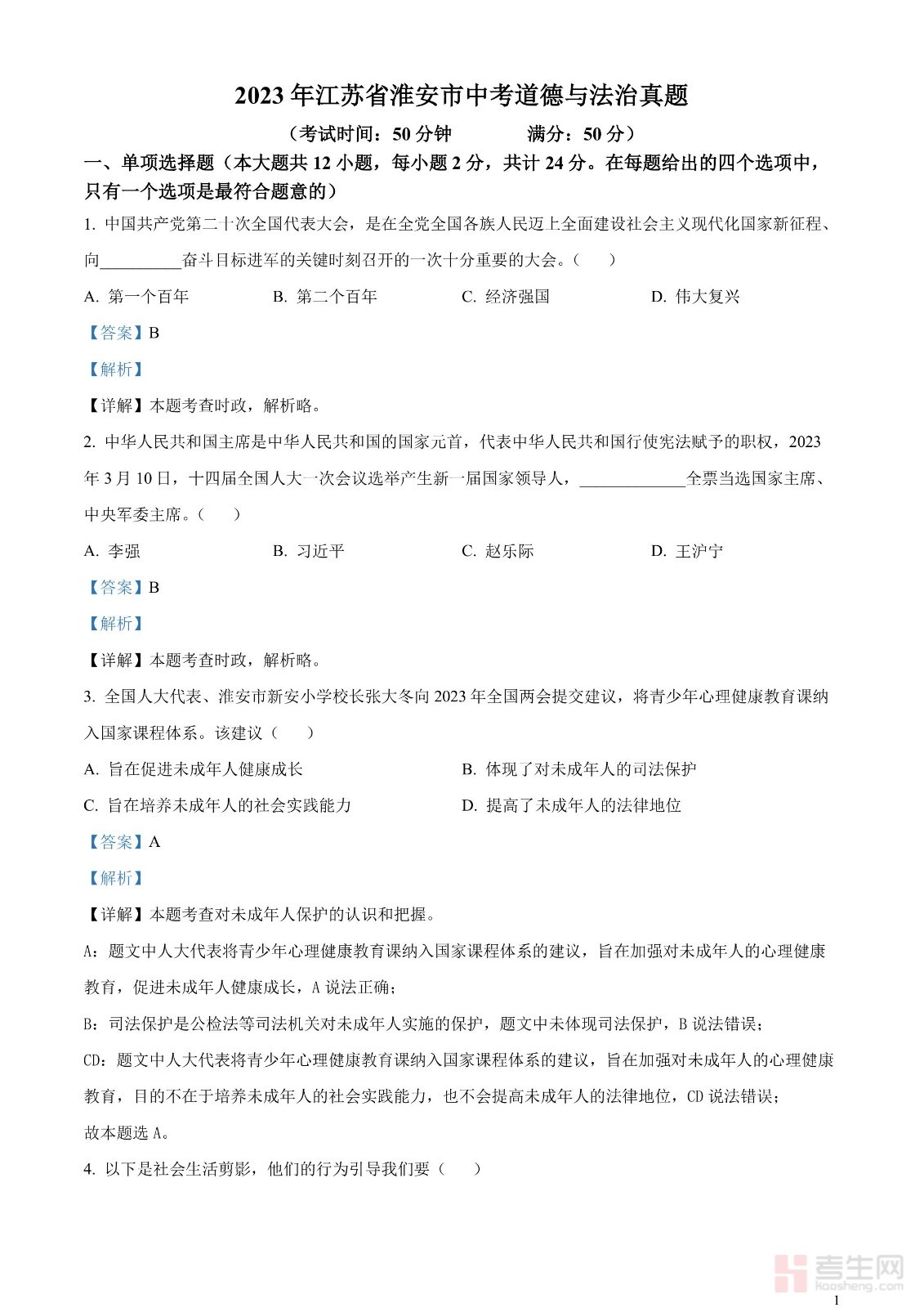 2023年江苏省淮安市中考道德与法治真题(解析版)