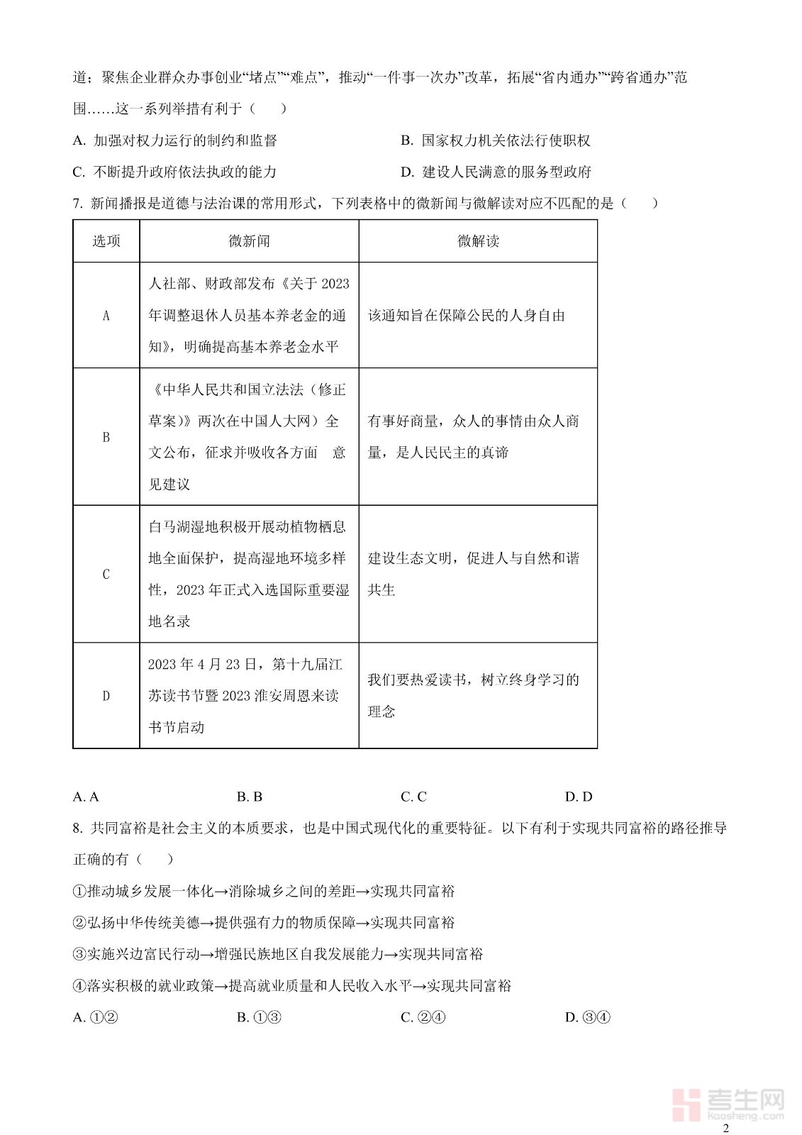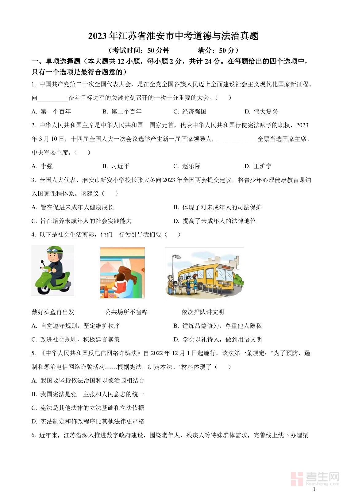 2023年江苏省淮安市中考道德与法治真题(原卷版)