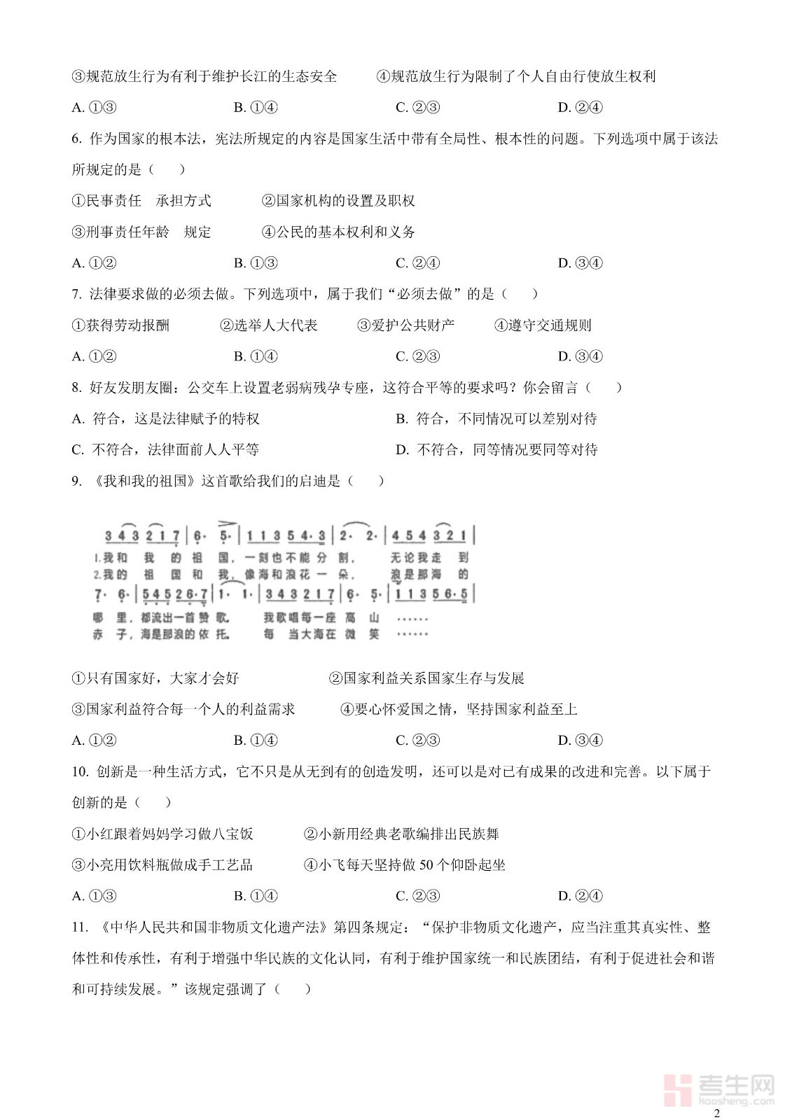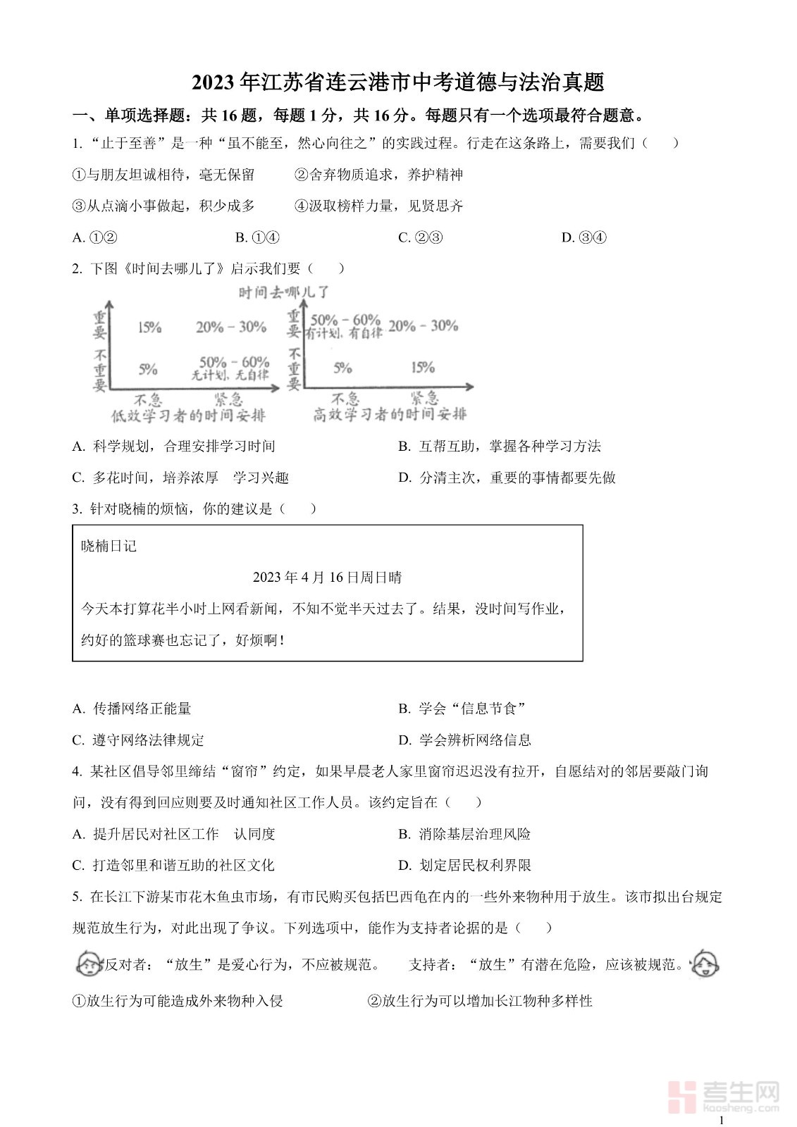 2023年江苏省连云港市中考道德与法治真题(原卷版)