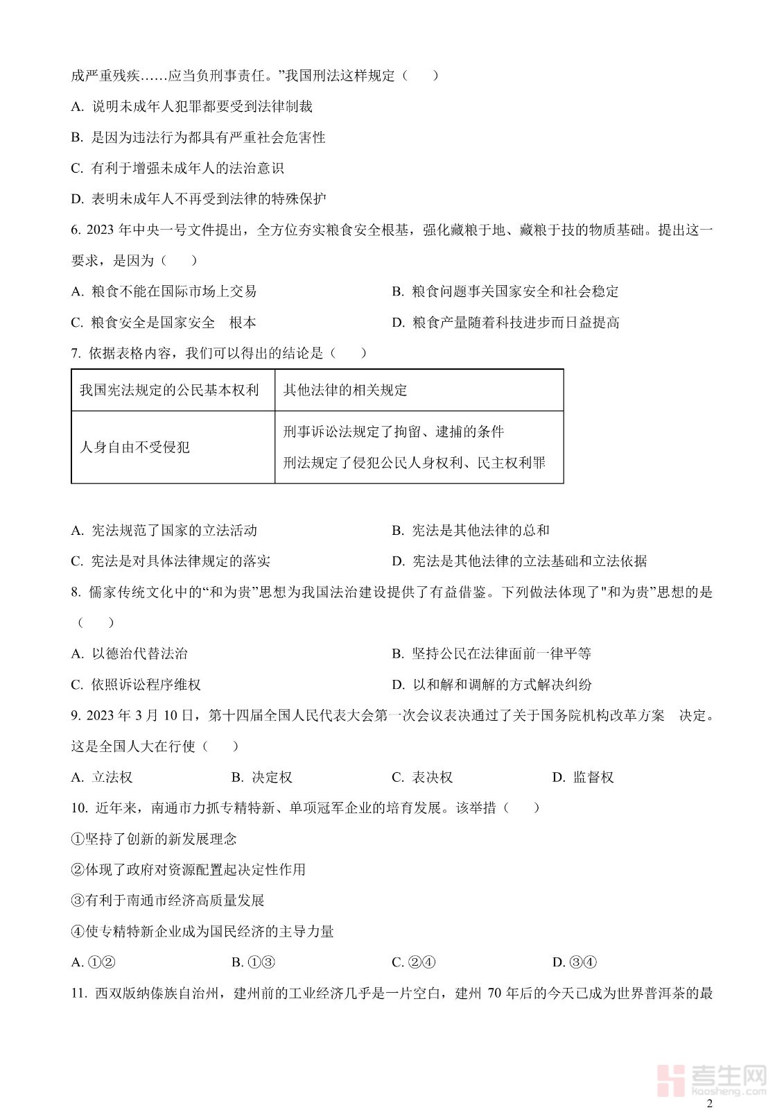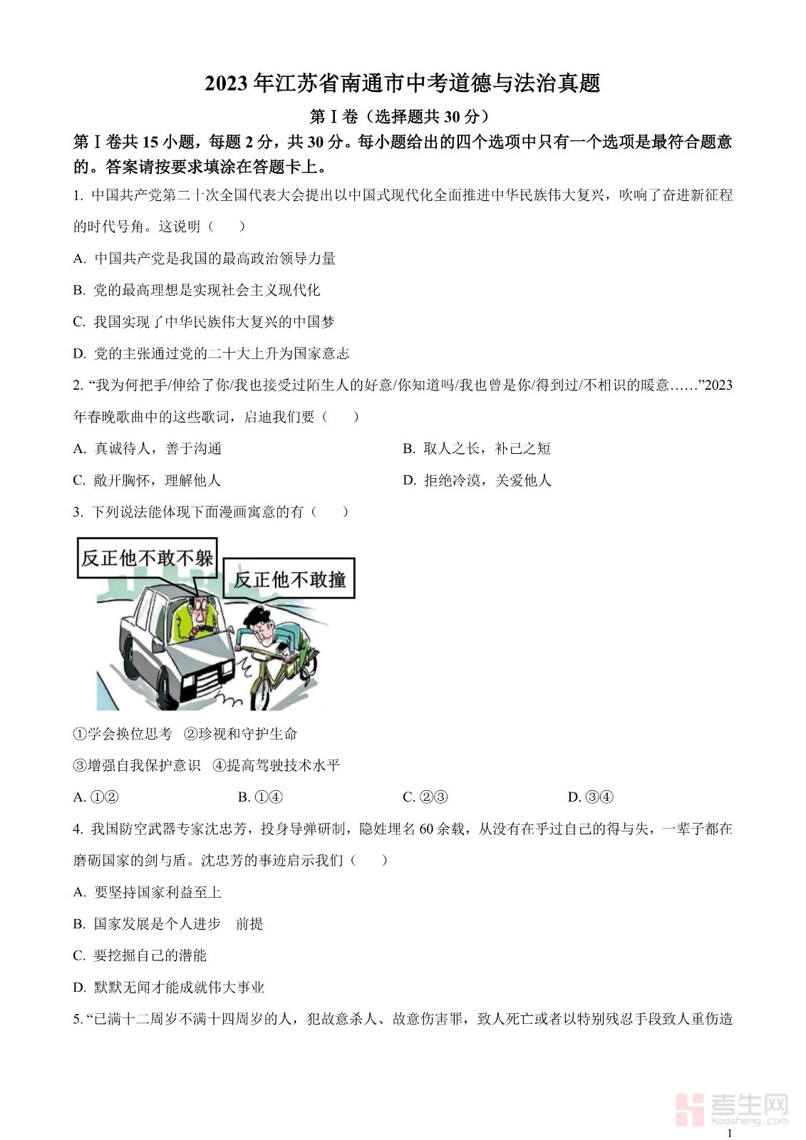 2023年江苏省南通市中考道德与法治真题(原卷版)