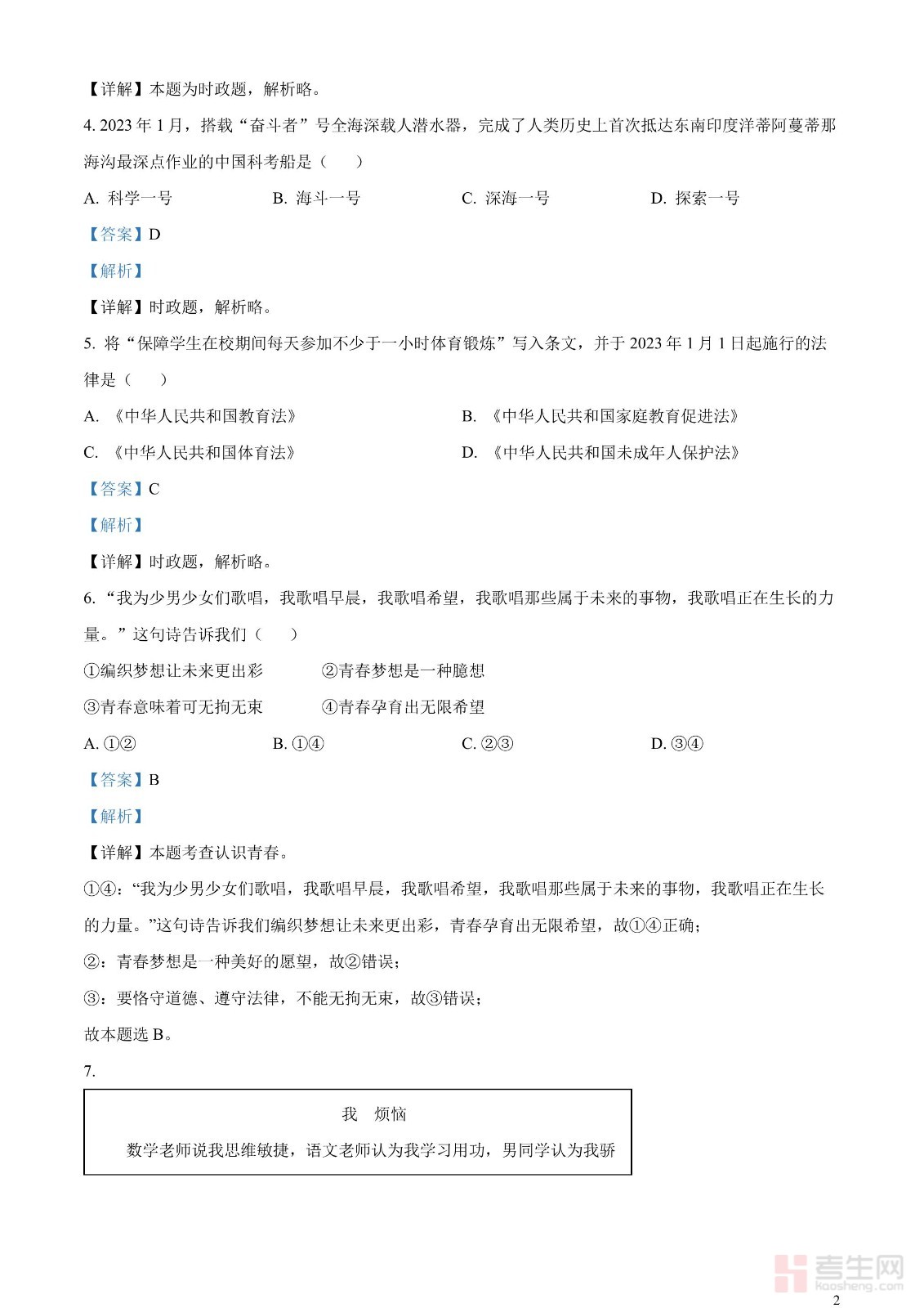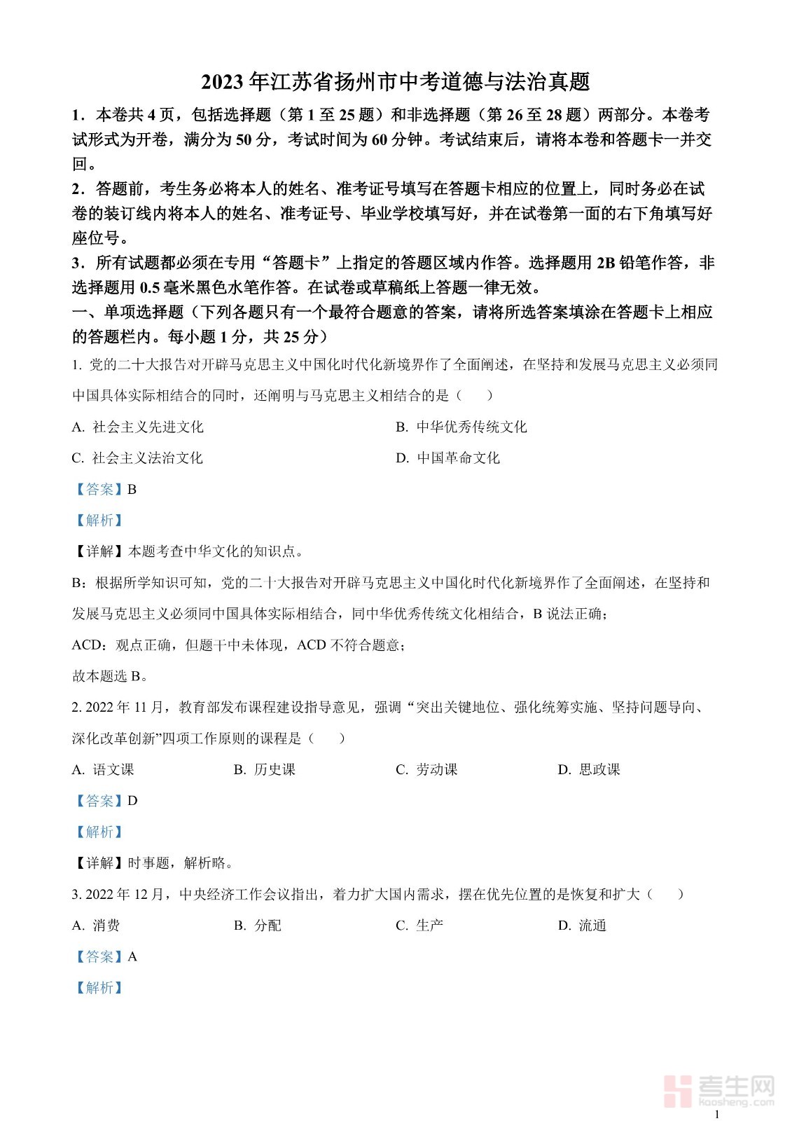 2023年江苏省扬州市中考道德与法治真题(解析版)