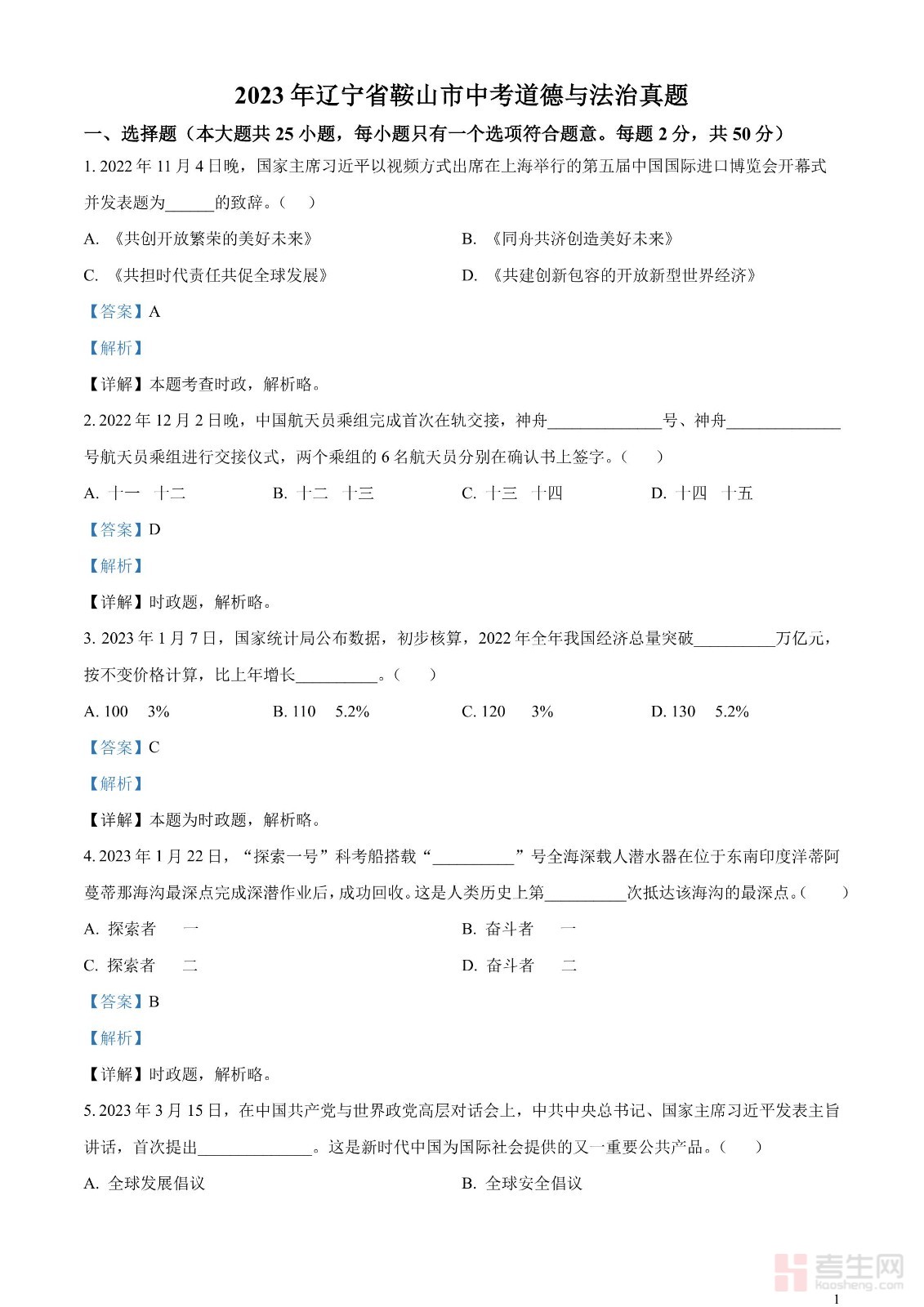 2023年辽宁省鞍山市中考道德与法治真题(解析版)