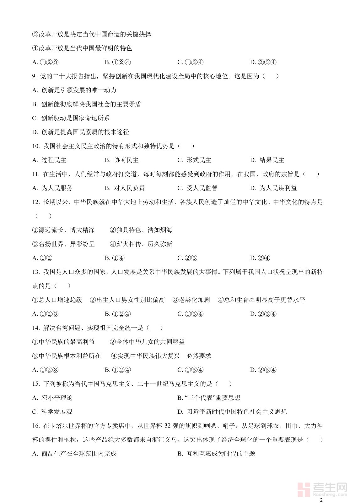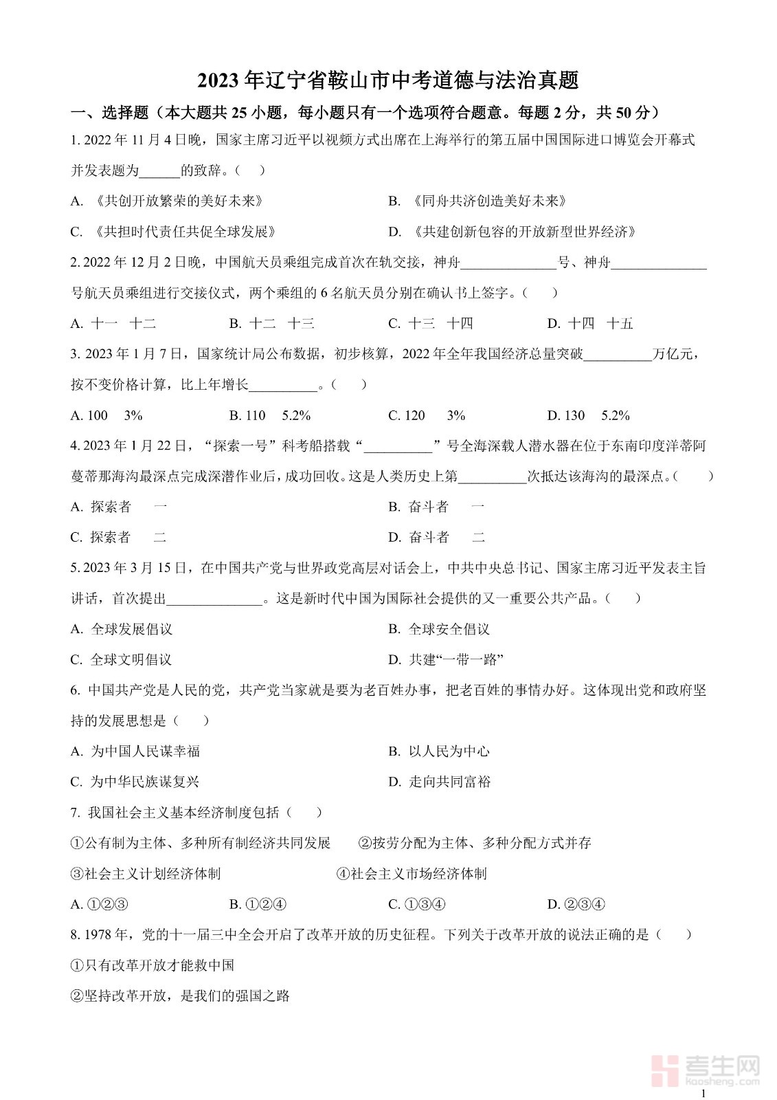 2023年辽宁省鞍山市中考道德与法治真题(原卷版)