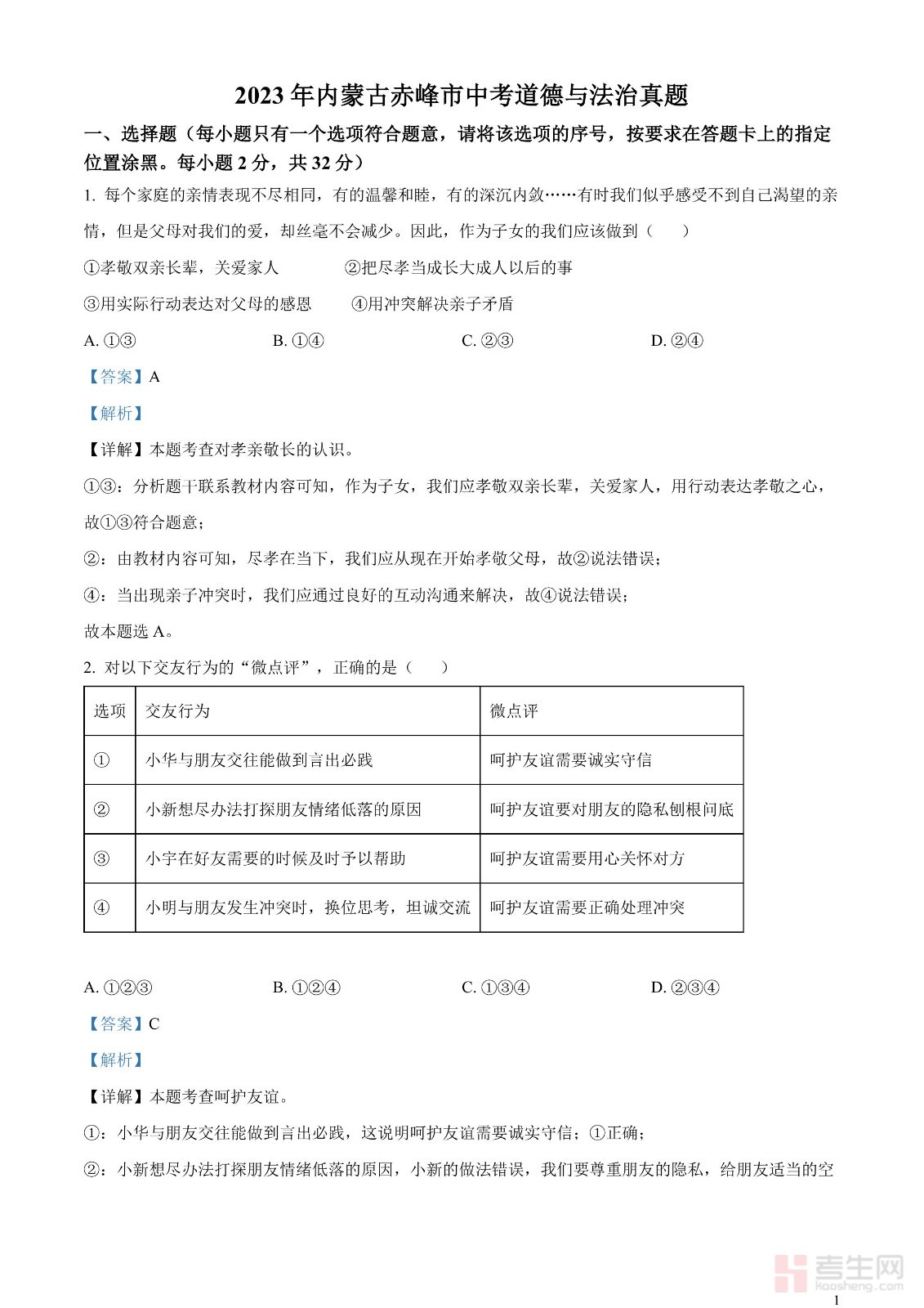 2023年内蒙古赤峰市中考道德与法治真题(解析版)