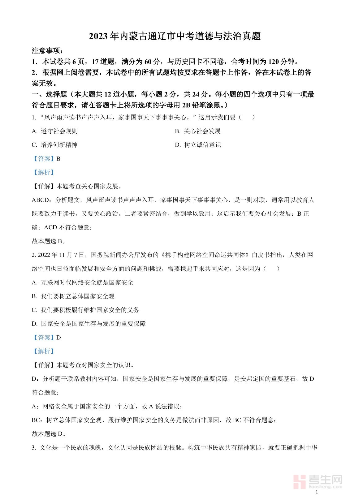 2023年内蒙古通辽市中考道德与法治真题(解析版)