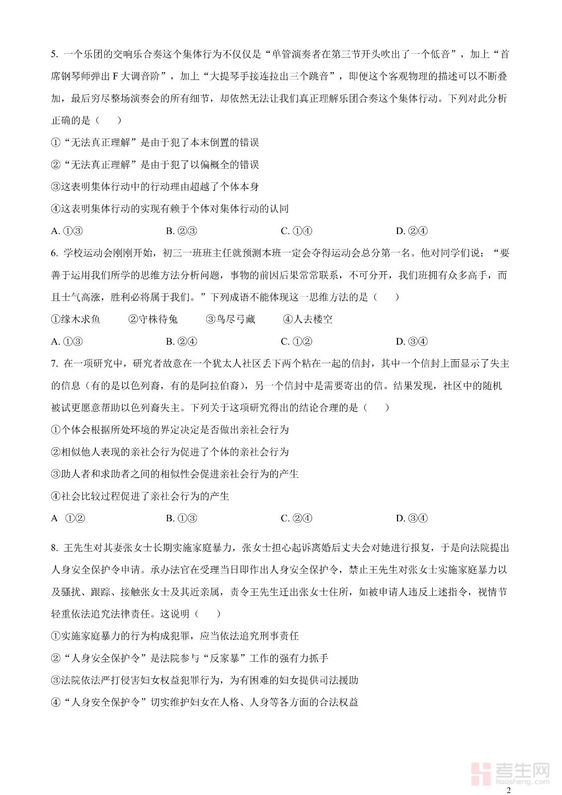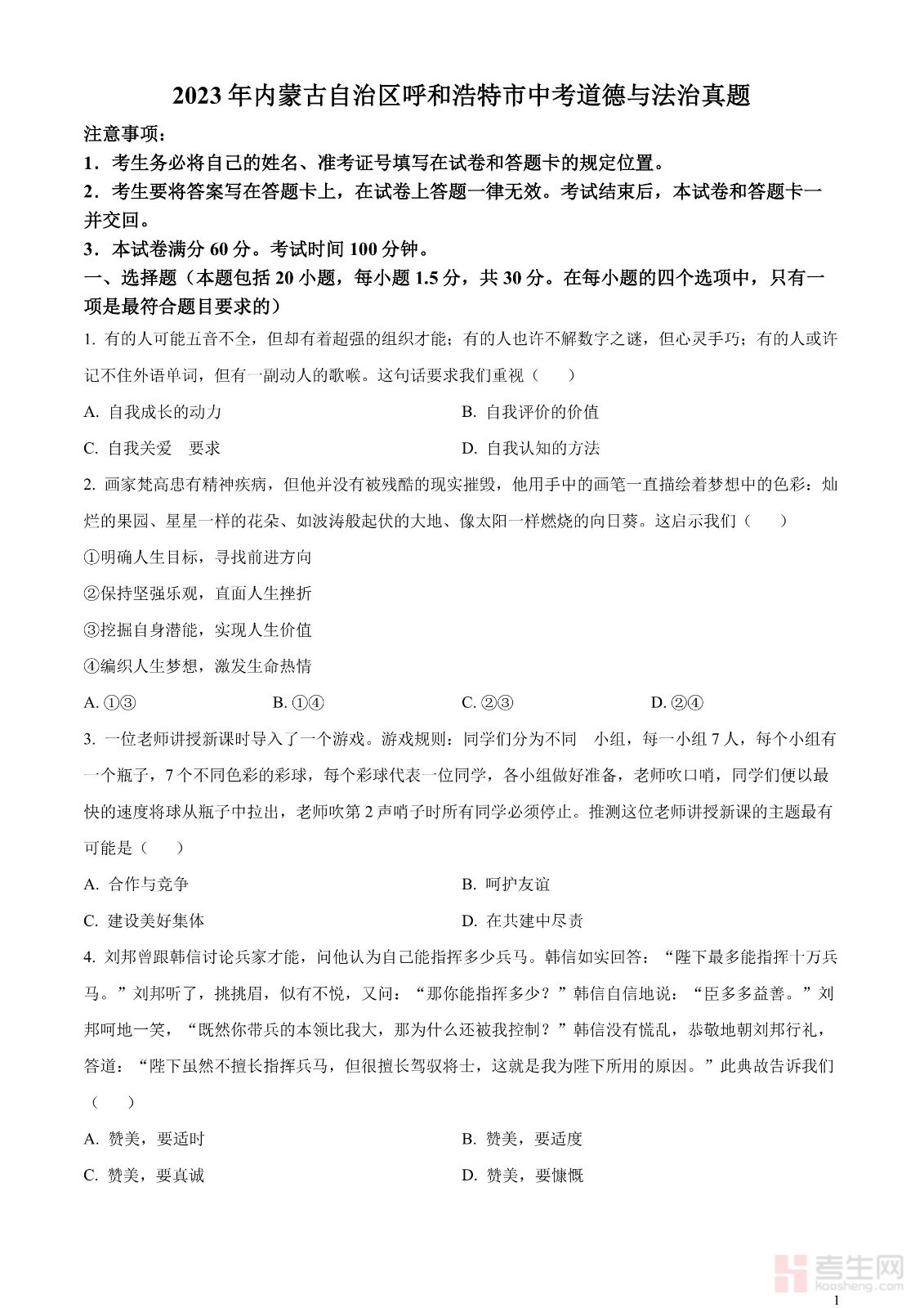 2023年内蒙古自治区呼和浩特市中考道德与法治真题(原卷版)