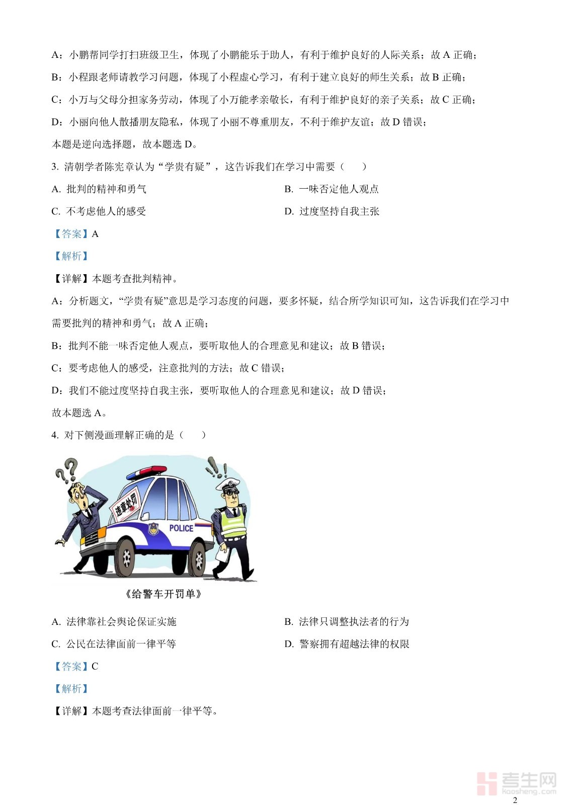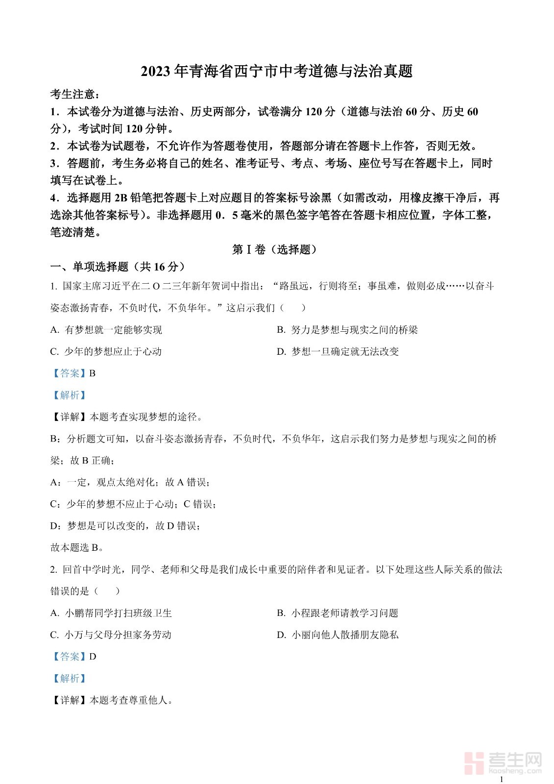 2023年青海省西宁市中考道德与法治真题(解析版)