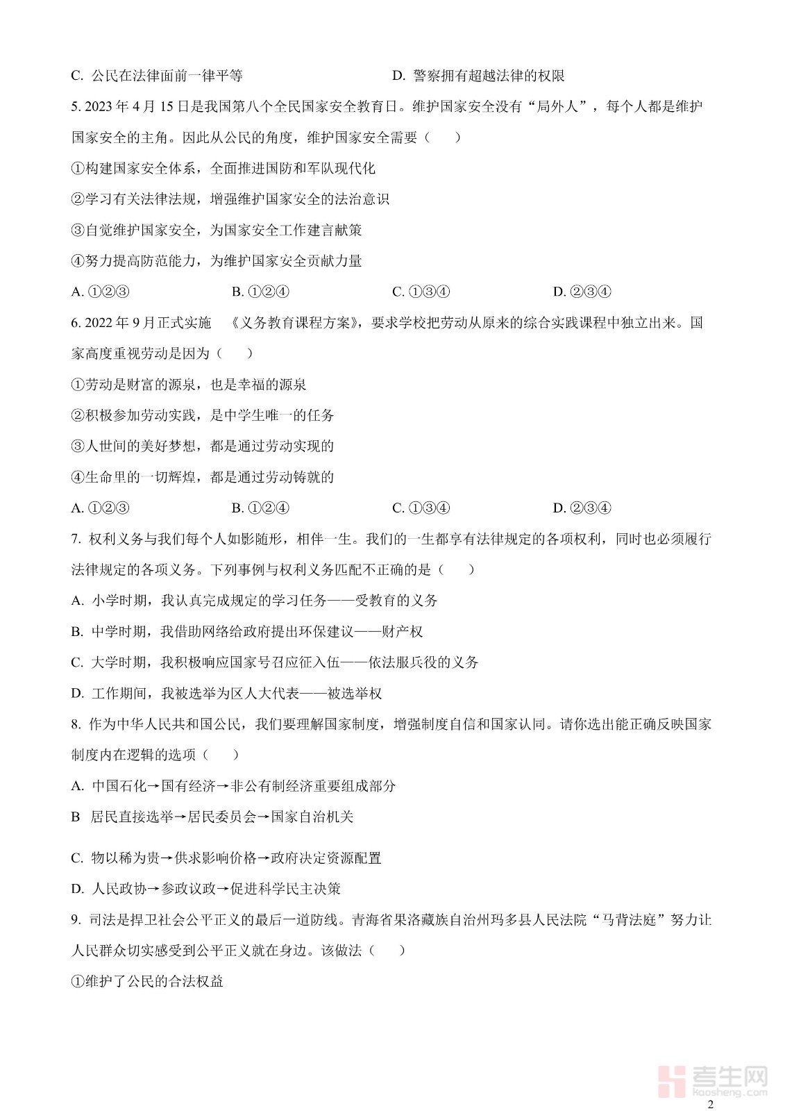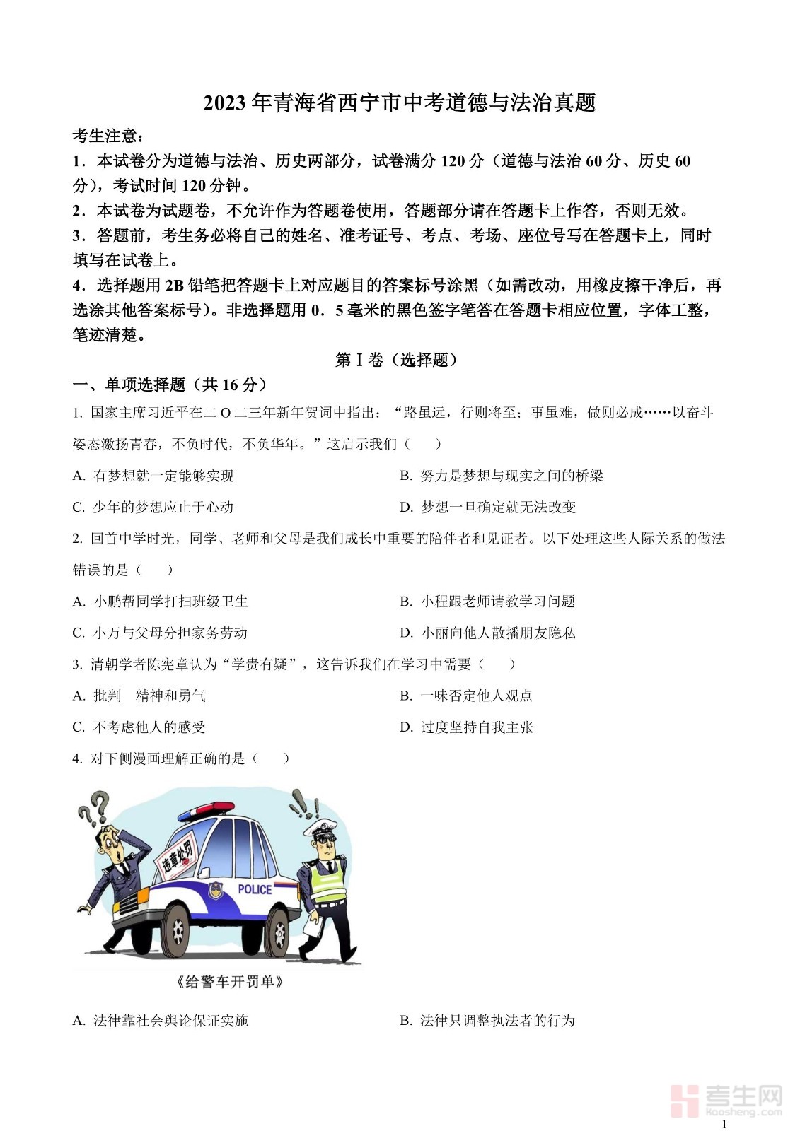 2023年青海省西宁市中考道德与法治真题(原卷版)