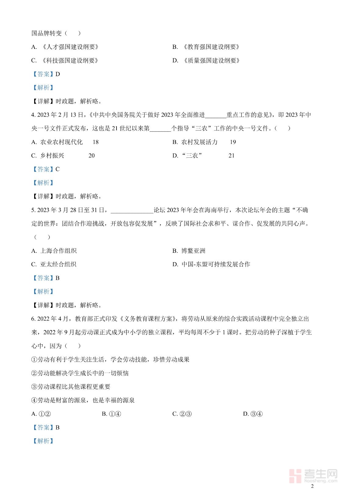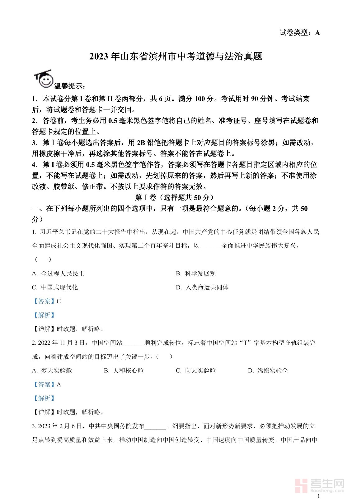 2023年山东省滨州市中考道德与法治真题(解析版)