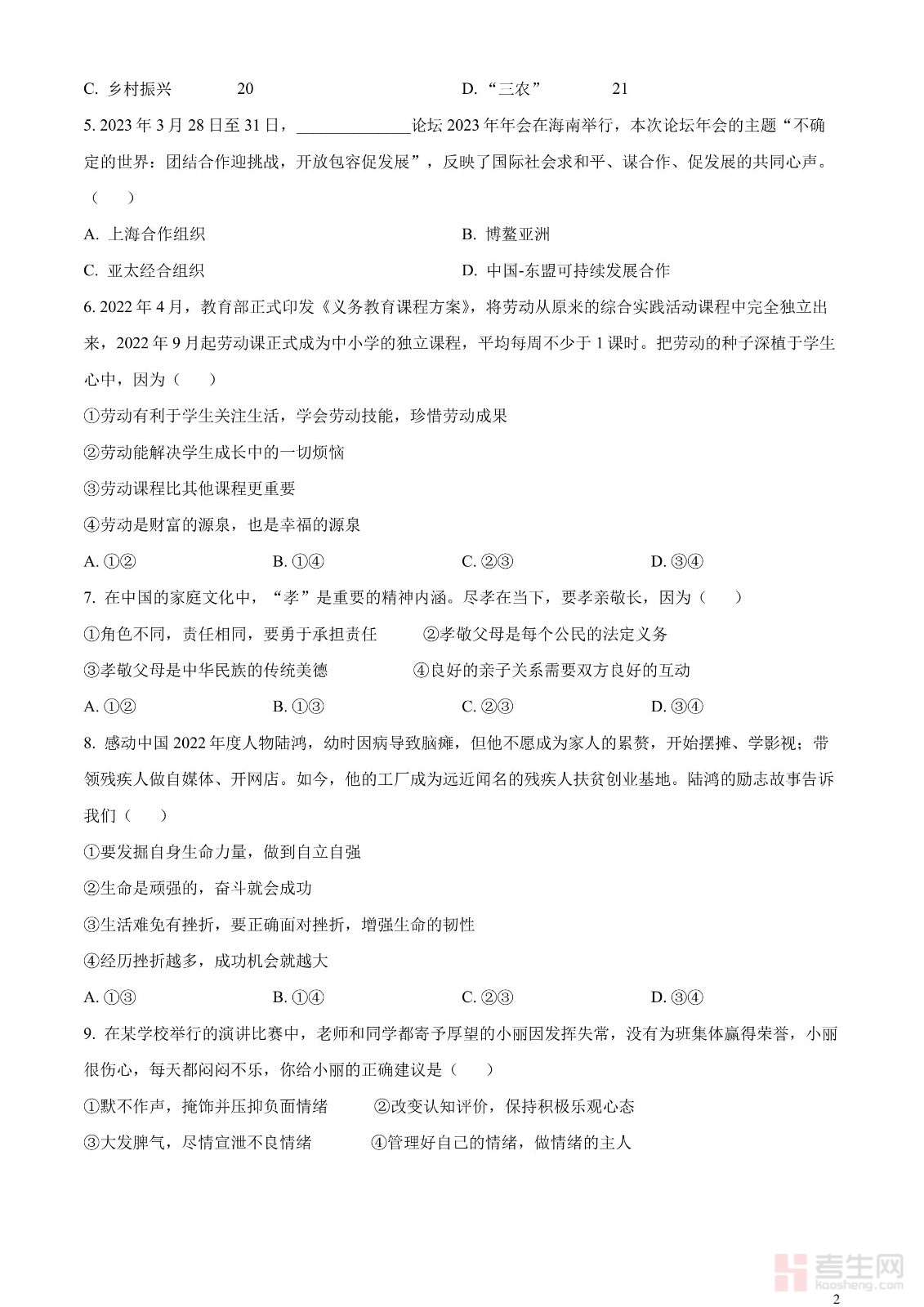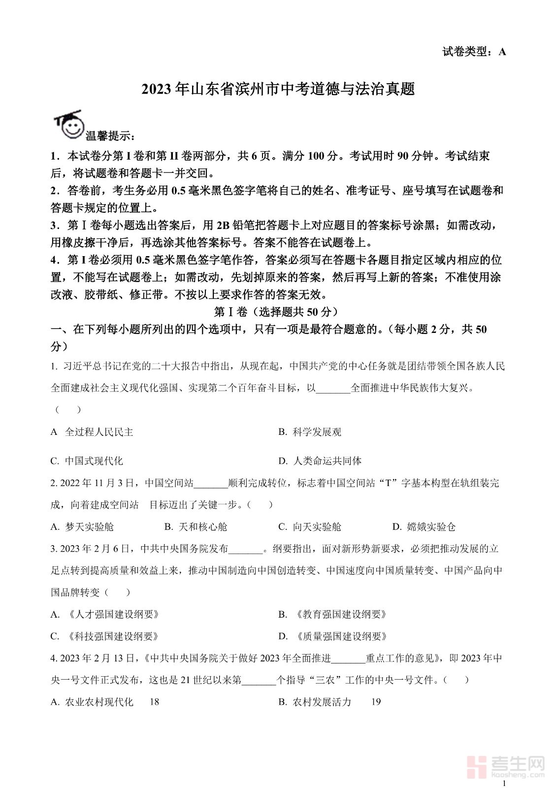 2023年山东省滨州市中考道德与法治真题(原卷版)