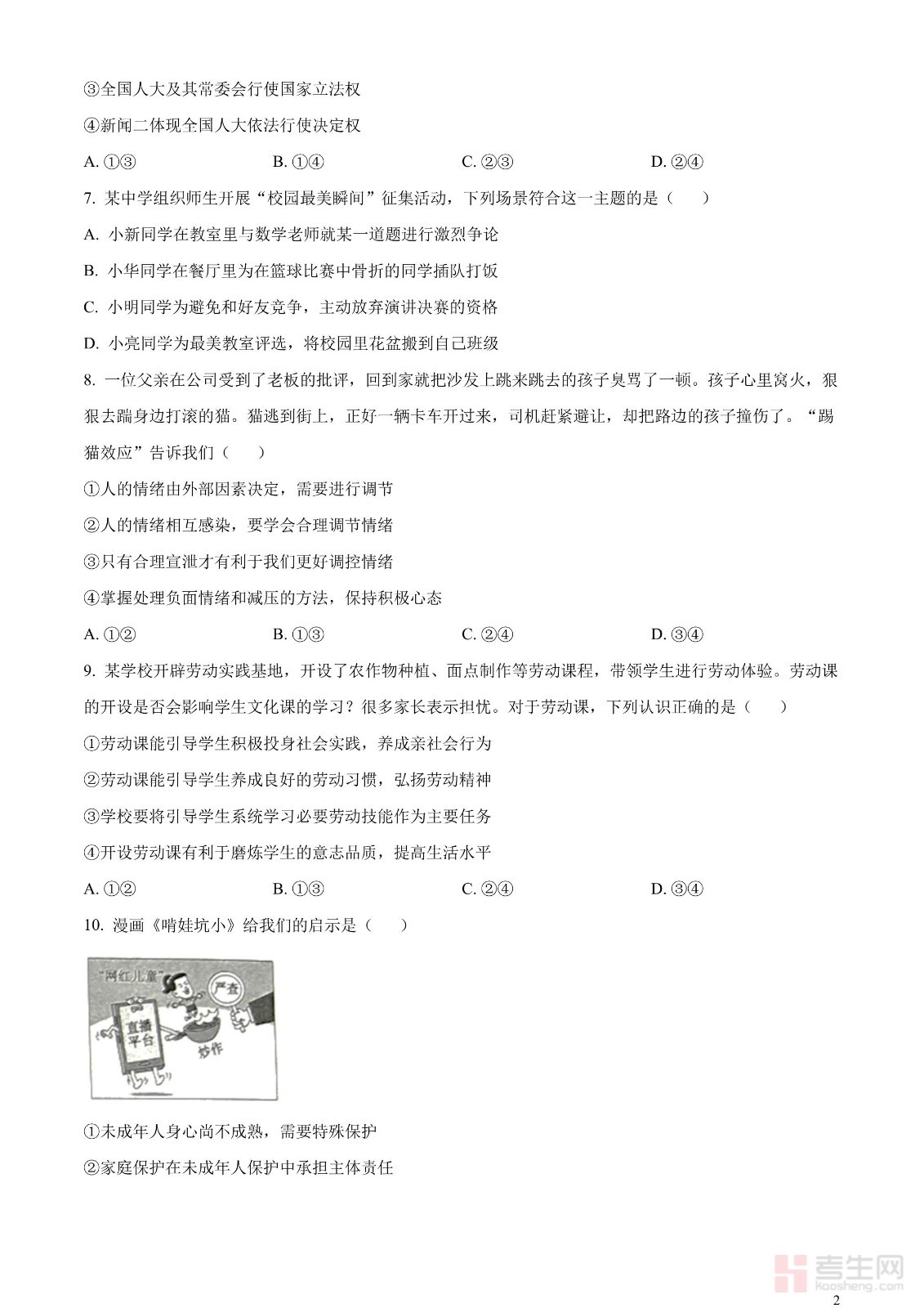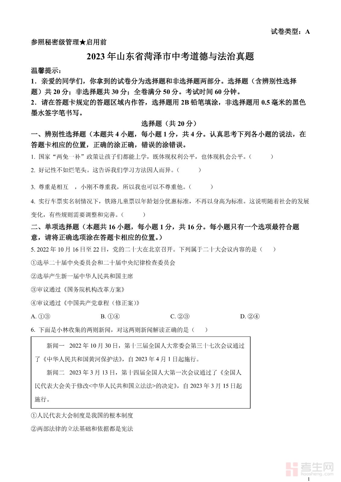 2023年山东省菏泽市中考道德与法治真题(原卷版)