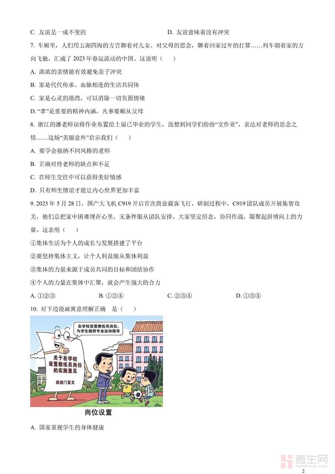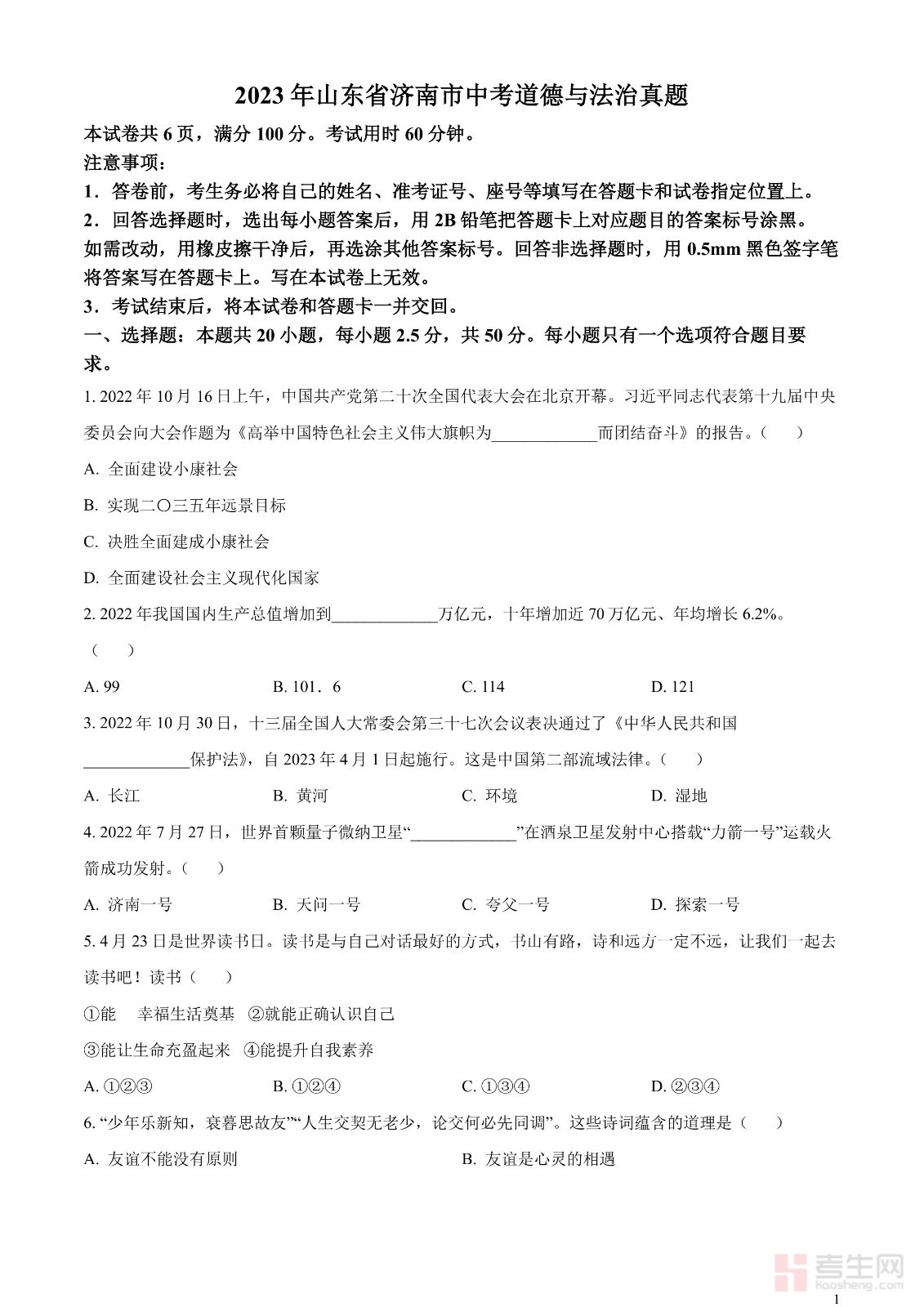 2023年山东省济南市中考道德与法治真题(原卷版)