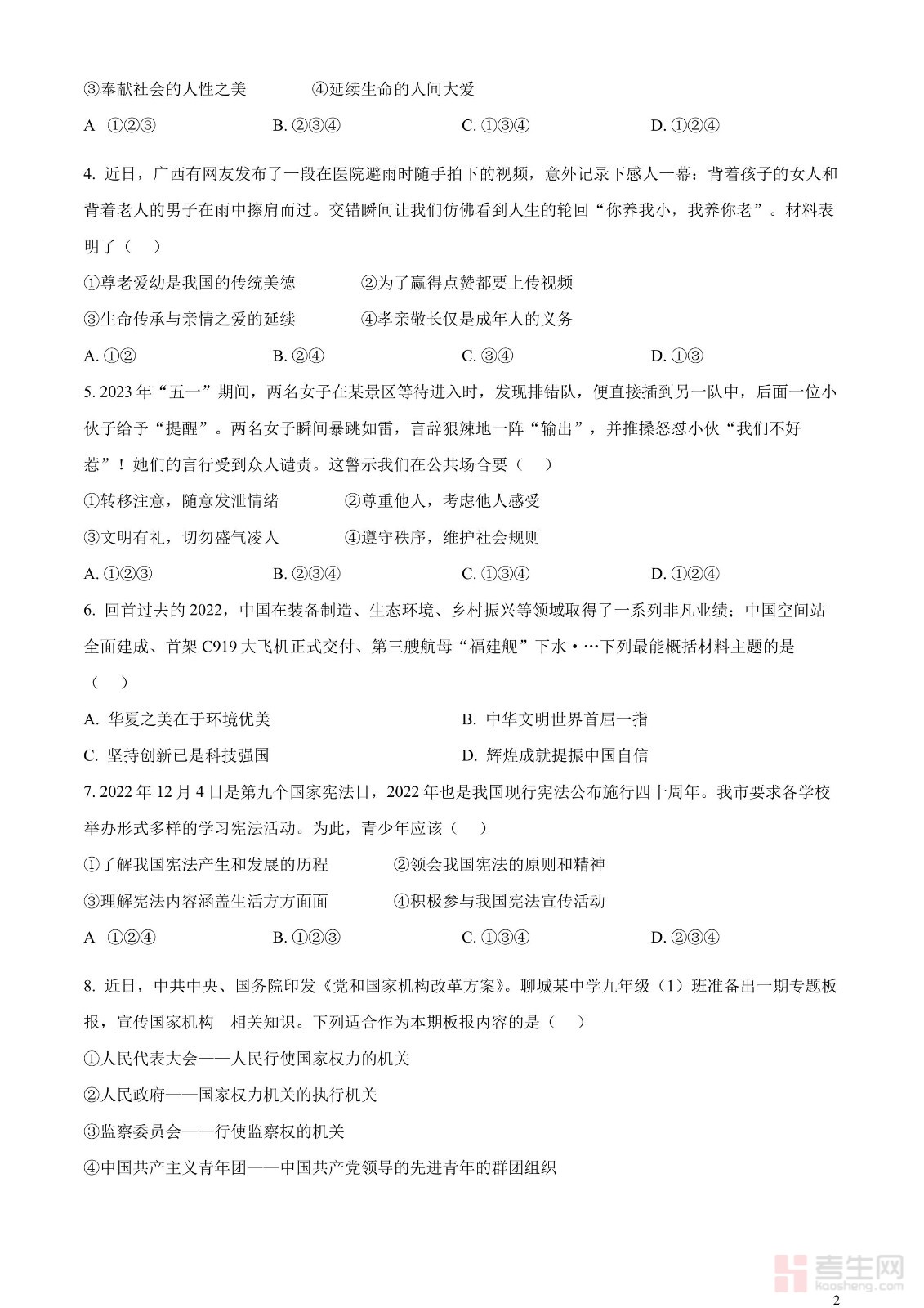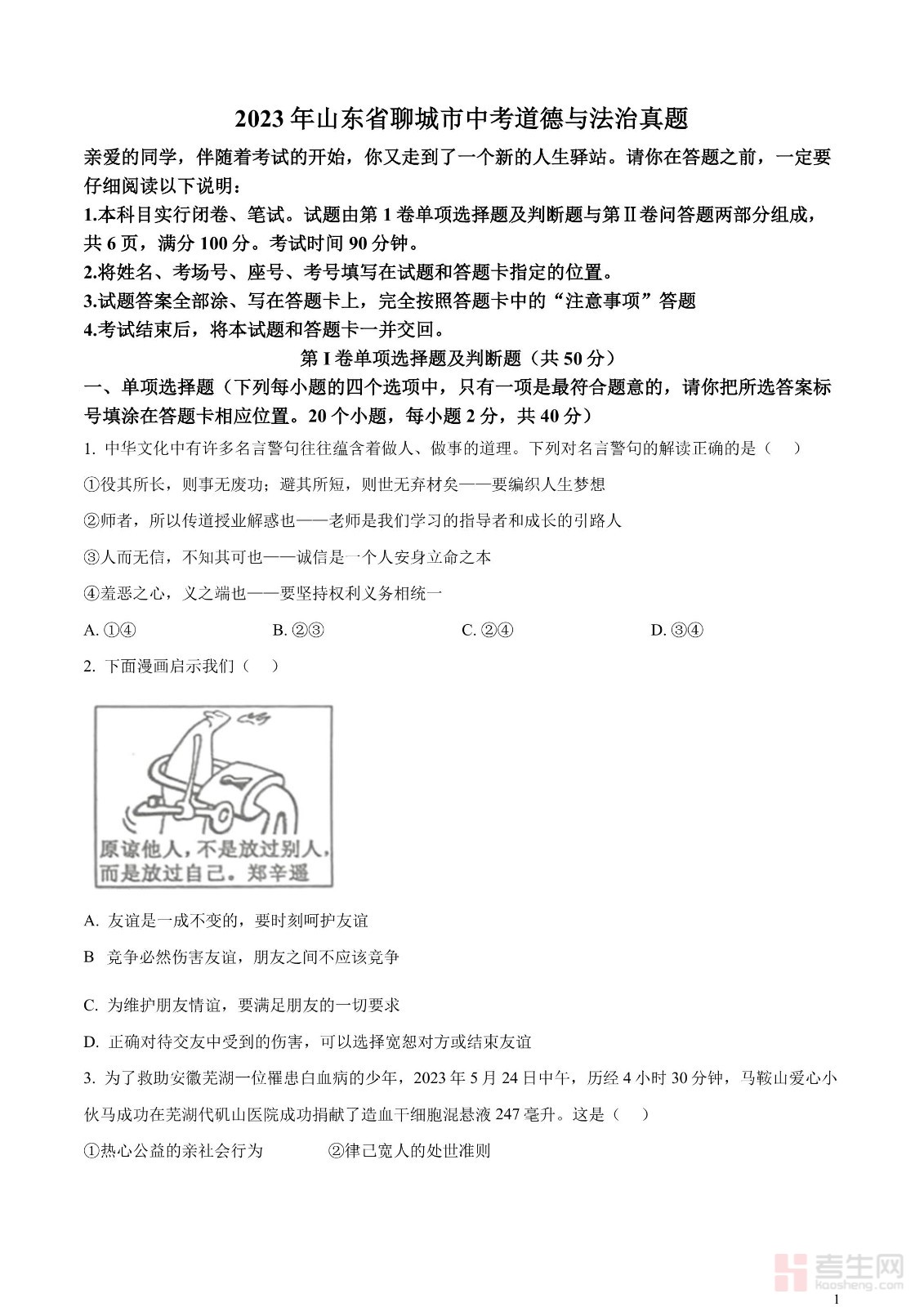 2023年山东省聊城市中考道德与法治真题 (原卷版)