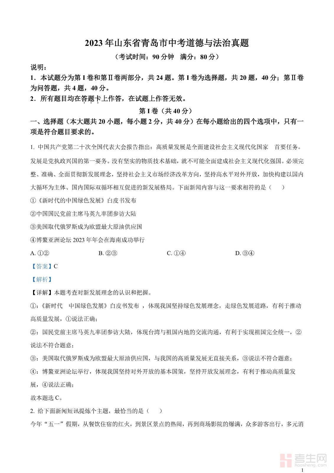 2023年山东省青岛市中考道德与法治真题(解析版)
