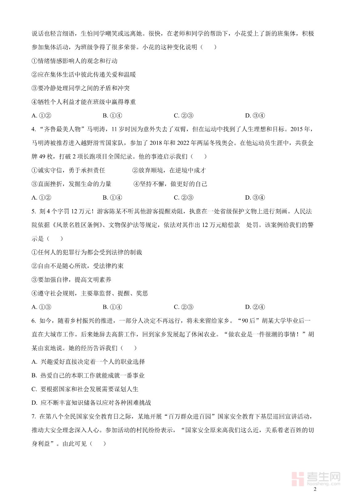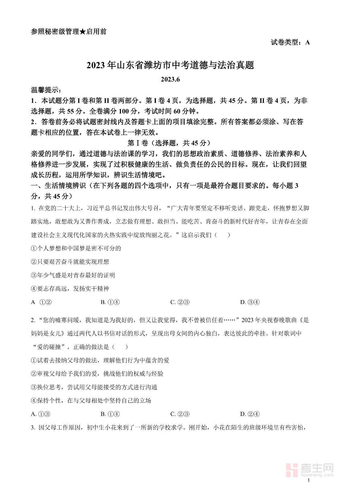 2023年山东省潍坊市中考道德与法治真题(原卷版)