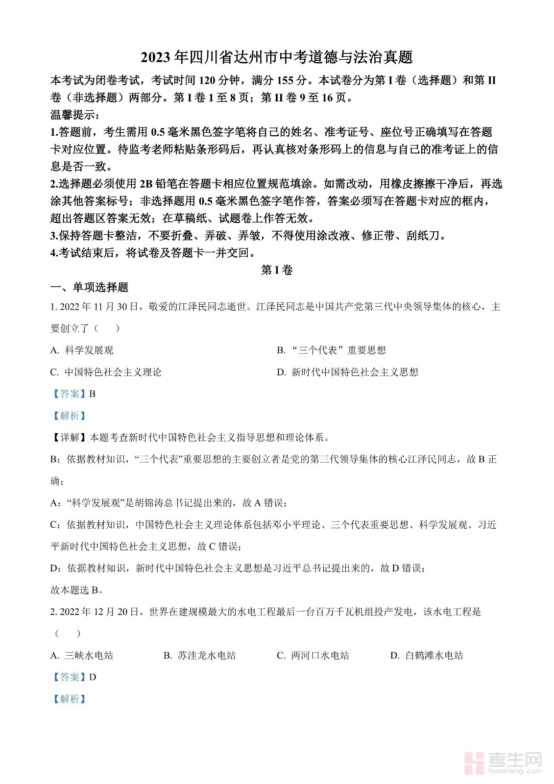 2023年四川省达州市中考道德与法治真题(解析版)