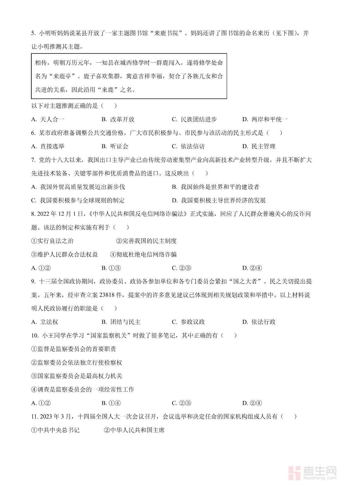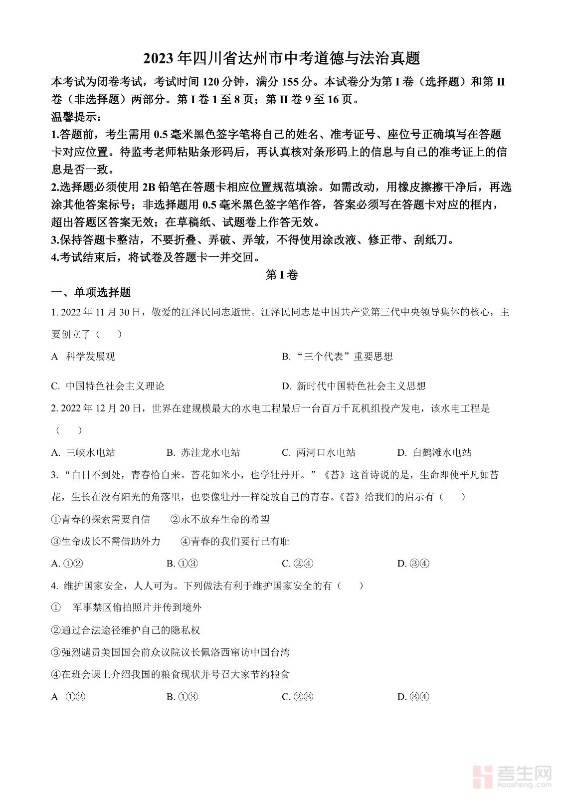 2023年四川省达州市中考道德与法治真题(原卷版)