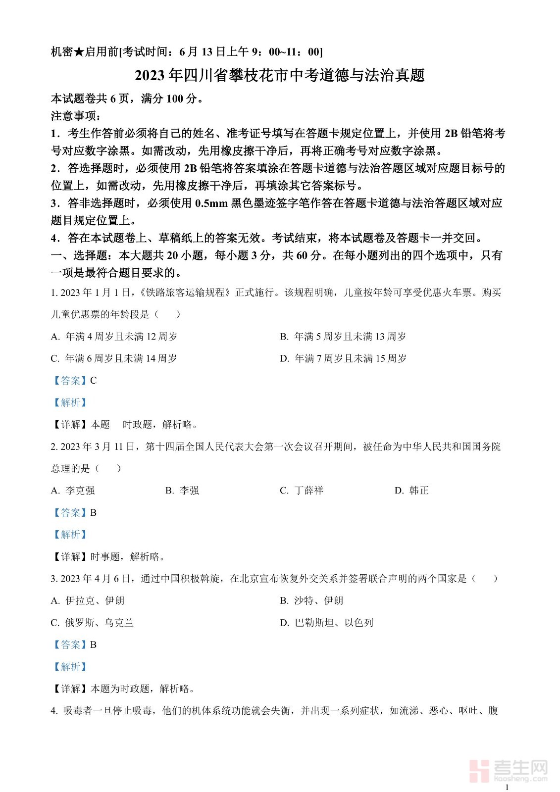 2023年四川省攀枝花市中考道德与法治真题(解析版)
